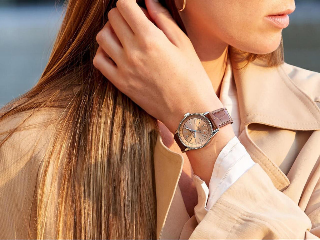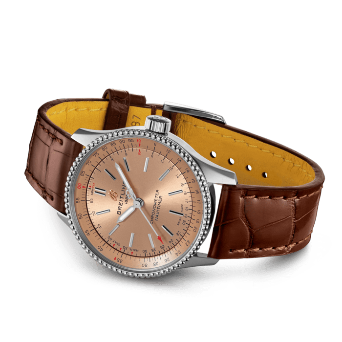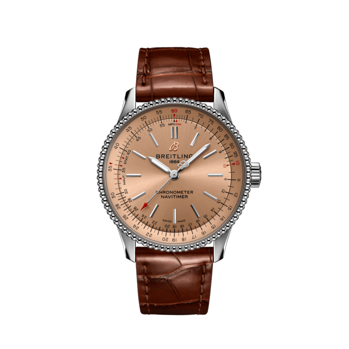 Refined and elegant, the Navitimer Automatic 35 combines the historic appeal of a true icon with the sophistication of a contemporary timepiece. Available in a variety of materials including stainless steel and 18k red gold, the 35 mm case features a beaded bezel and a range of elegant dial colors, as well as diamond-set white mother of pearl. Offered either with a matching bracelet or alligator strap that fits both a stainless steel pin or folding buckle, the Navitimer Automatic 35 is powered by the Breitling Caliber 17, a COSC-certified chronometer.