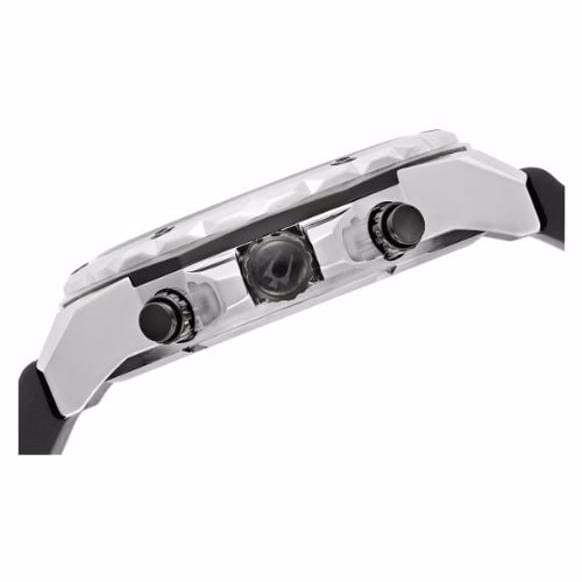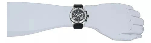 Three useful sub-dials offer chronograph functions, and a convenient date display sits between four and five o'clock. Detailed with a tapered edge, the durable, black rubber strap fastens with a traditional buckle for an adjustable fit. Water resistant to 330 feet (100 meters), this high-performance timepiece will stand up to your active and independent lifestyle.