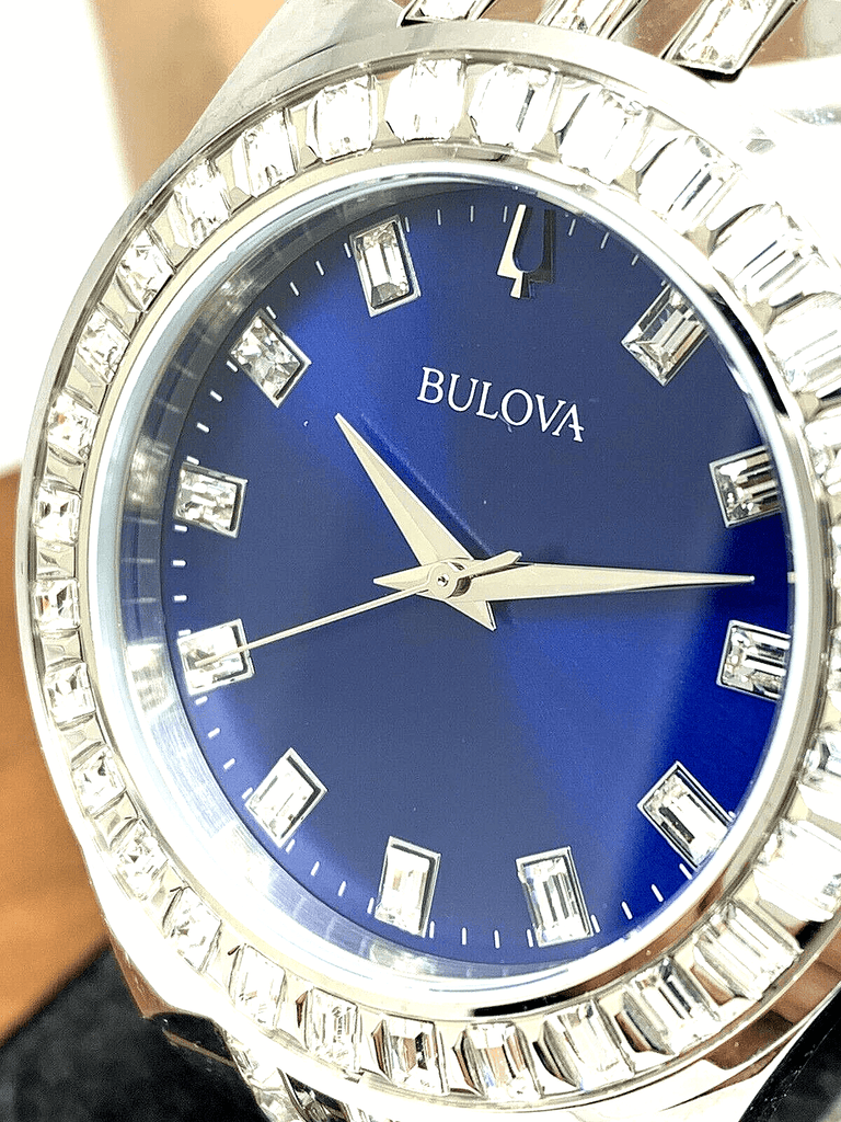 Blue dial enhanced by silver-tone hands. Silver-tone stainless steel case with a silver-tone stainless steel set with baguette crystals band. Quartz movement. 30 meters / 100 feet water resistance. Fixed bezel. Scratch Resistant Mineral crystal. Solid caseback. Fold Over clasp. Pull / Push crown. Case size 42 mm x 9.65 mm. Bulova 96A254 Crystal Watch.