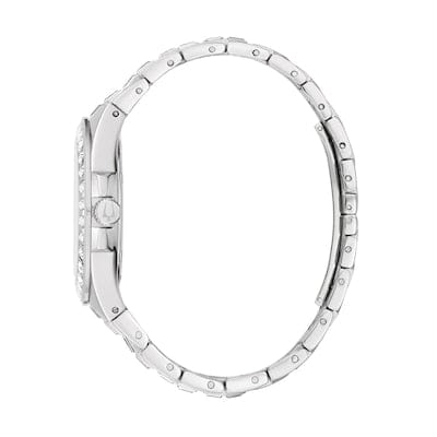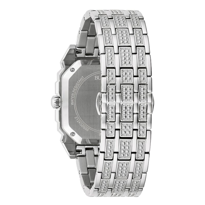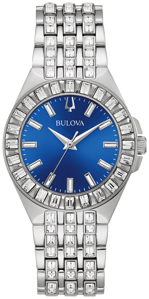A perfect pair to the 42mm Bulova Crystal Phantom, this is a smaller version, at just 32mm, features quartz movement, and the stainless steel case, with 83 authentic baguette crystals. It is finished with a bold blue three-hand dial and stainless steel silver-tone bracelet. This is truly a statement piece, evoking a look of luxury.