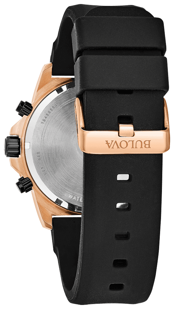 This Bulova watch has a 44mm rose gold tone stainless steel case, black patterned dial with luminous hands, rose gold-tone accents, mineral crystal, water resistance 100 meters, quartz movement 0S20 and black rubber strap with 3-piece buckle closure.