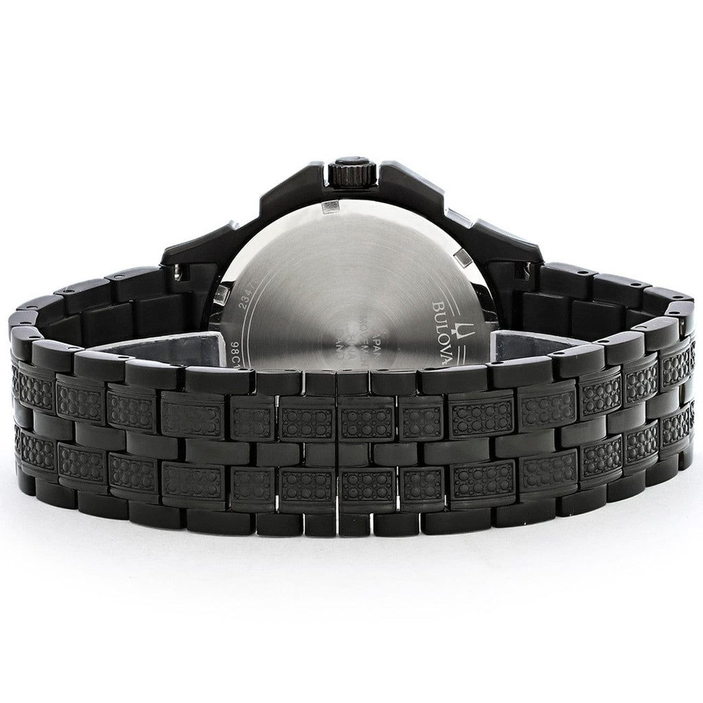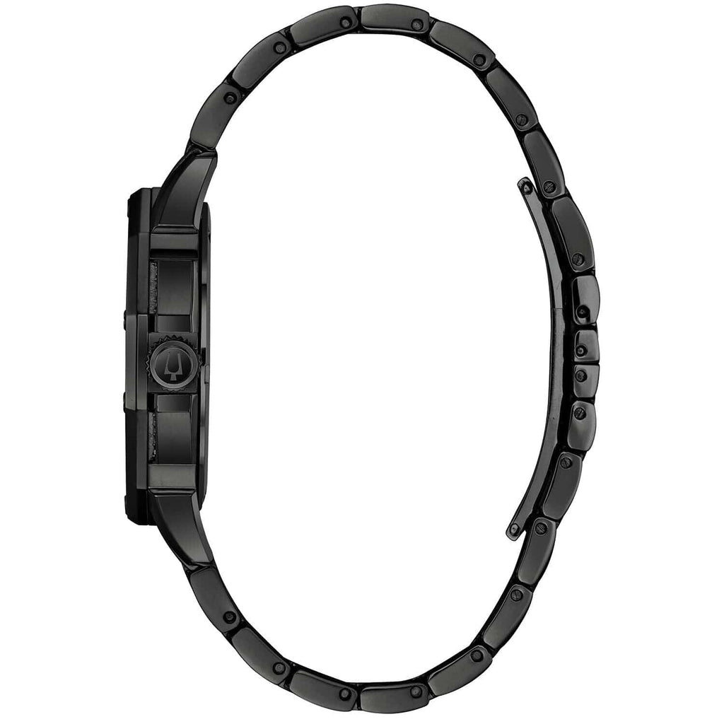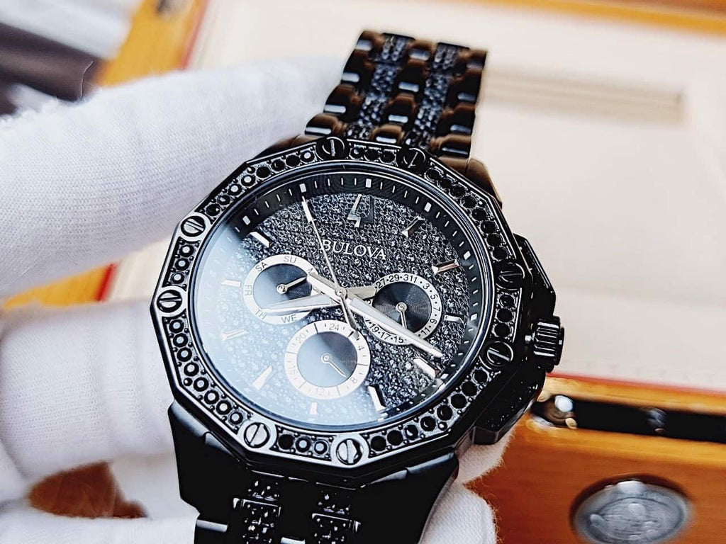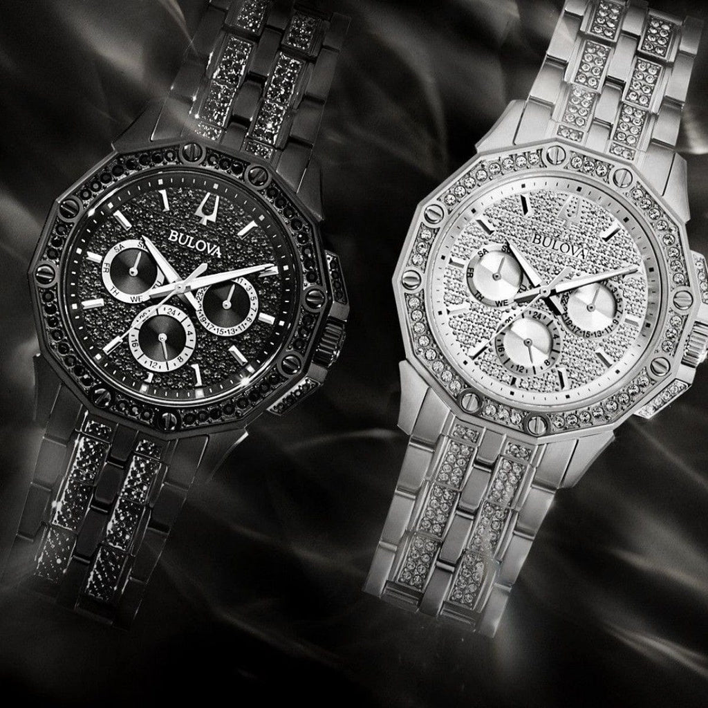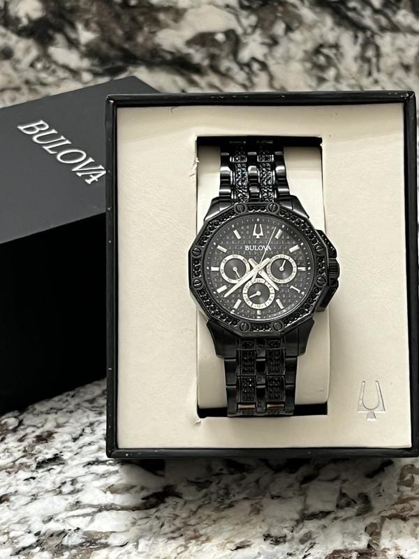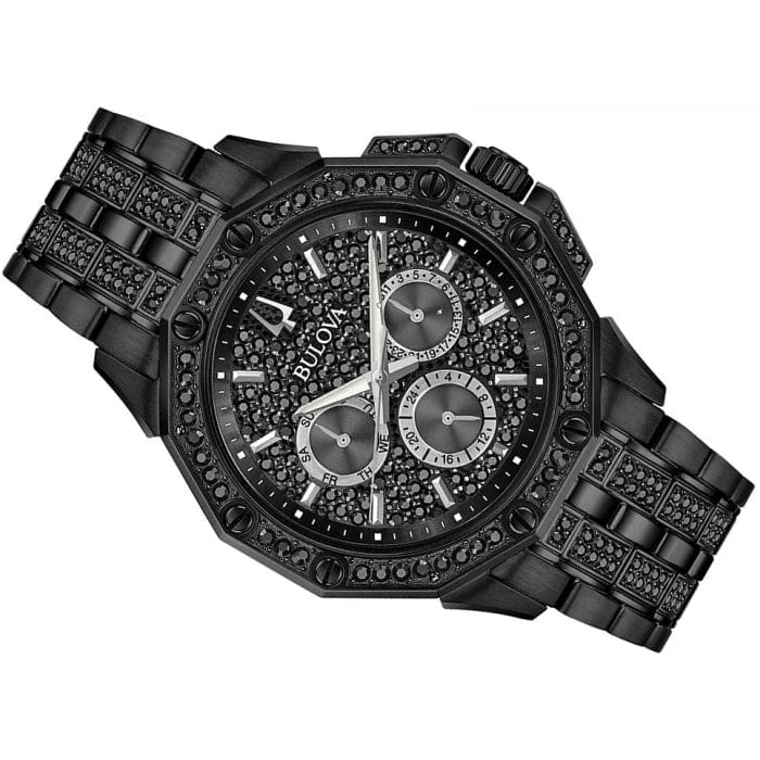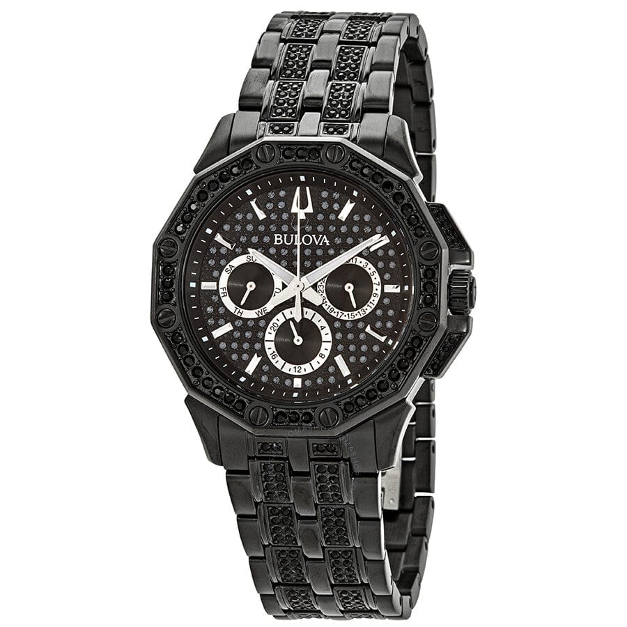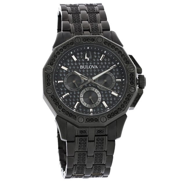 Black crystals on the dial, bezel and bracelet distinguish this handsome chronograph watch from the Octava Collection by Bulova. The 43mm black ion-plated stainless steel case is topped by a mineral crystal, while the black ion-plated stainless steel bracelet secures with a push-button deployment clasp. Water-resistant to 30 meters, the watch showcases three subdials, luminous hands and features a quartz movement.