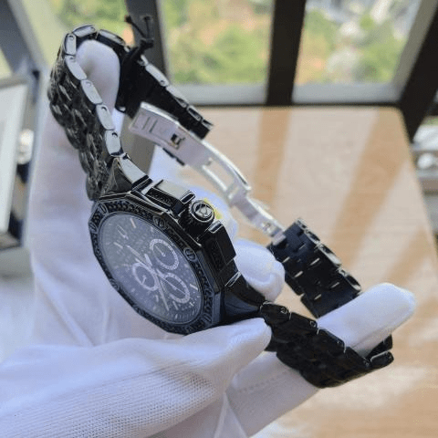 Multifunction dress watch adorned with 300 Swarovski® crystals on the black tone stainless steel case and strap with black dial. Water resistance up to 30 meters.