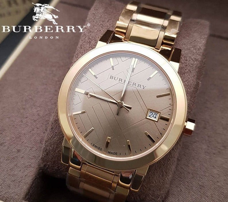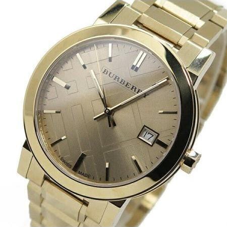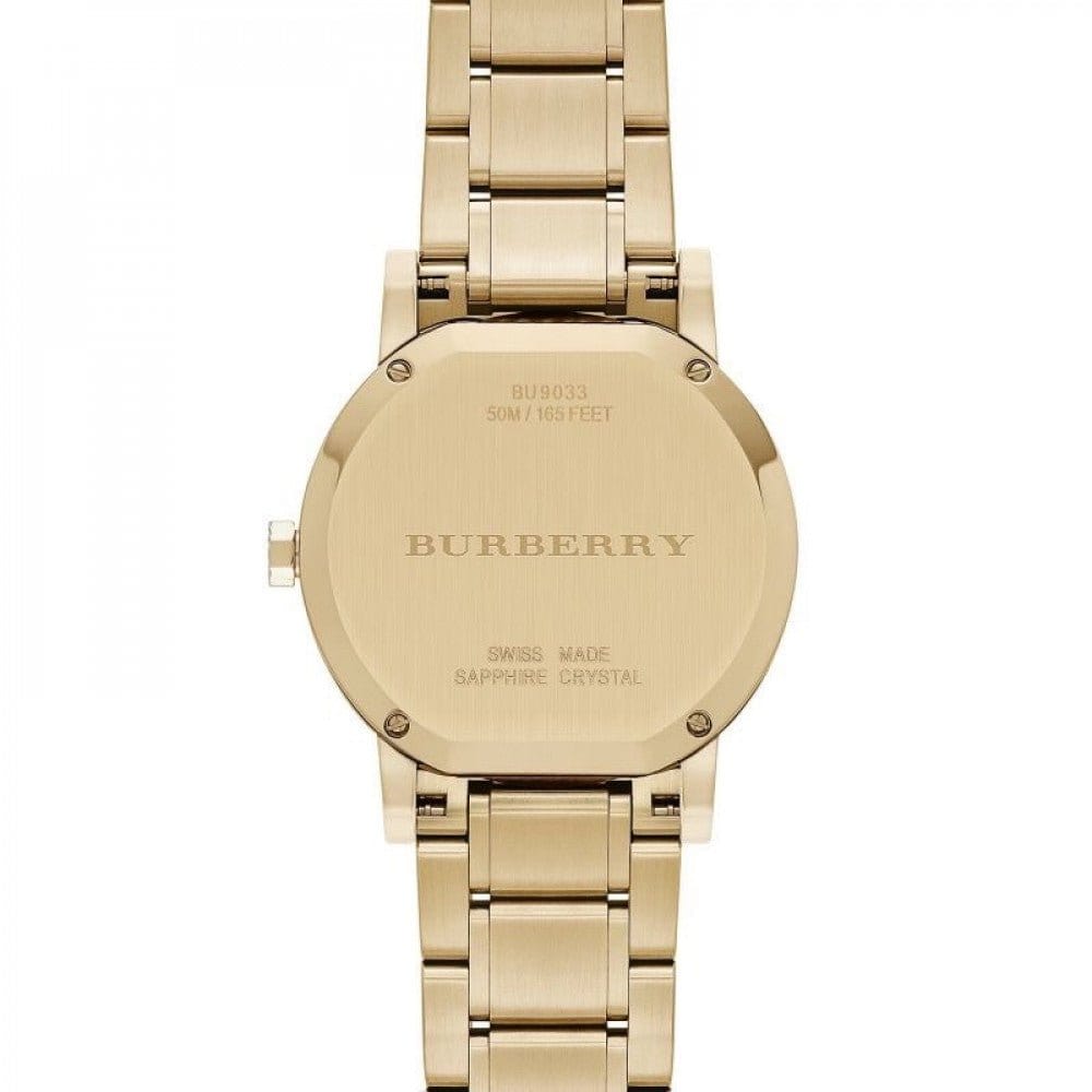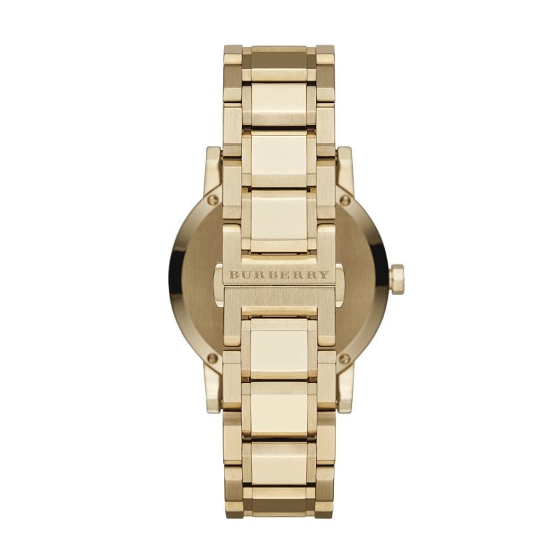 Case diameter: 38 mm. Round case shape. Band width: 20 mm. Deployment clasp. Water resistant at 50 meters / 165 feet. Functions: date, hour, minute, second. Casual watch style. Watch label: Swiss Made. Burberry The City Champagne Dial Gold-tone Unisex Watch BU9033.