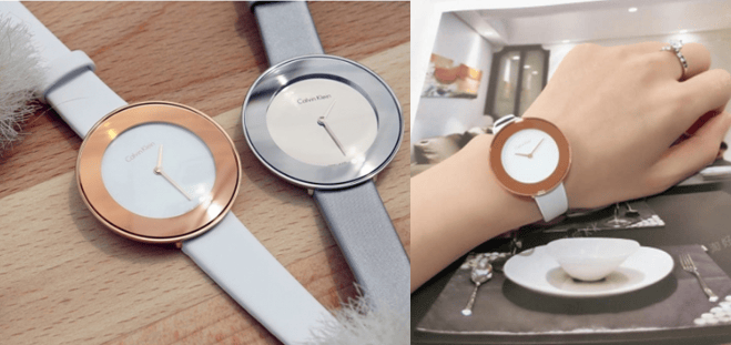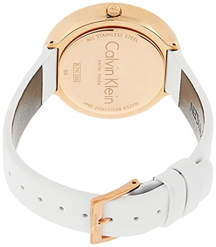 Rose gold-tone stainless steel case with a white satin (leather backed) strap. Fixed rose gold-tone bezel. White dial with rose gold-tone hands. No markers. Dial Type: Analog. ETA caliber 901.001 quartz movement. Scratch resistant mineral crystal. Pull / push crown. Solid case back. Round case shape. Case size: 38 mm. Case thickness: 7 mm. Band width: 18 mm. Tang clasp. Water resistant at 30 meters / 100 feet. Functions: hour, minute. Casual watch style. Watch label: Swiss Made. Calvin Klein Chic White Dial Ladies Watch K7N236K2.