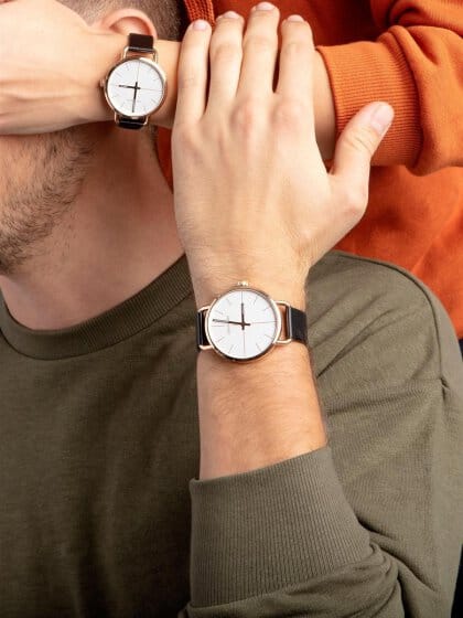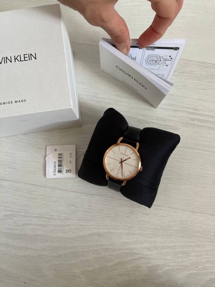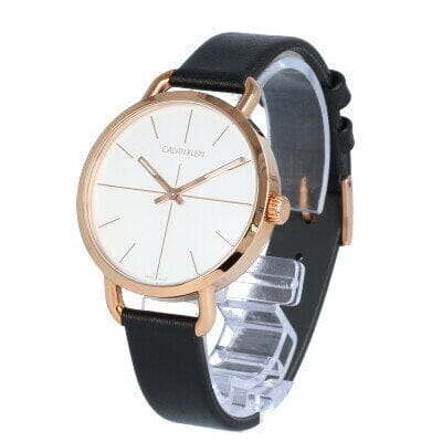Rose gold PVD stainless steel case with a black leather strap. Fixed rose gold PVD bezel. Silver dial with luminous rose gold-tone hands and index hour markers. Dial Type: Analog. Luminescent hands. ETA caliber F05.401 quartz movement. Scratch resistant mineral crystal. Pull / push crown. Solid case back. Round case shape. Case size: 36 mm. Case thickness: 8 mm. Band width: 14 mm. Tang clasp. Water resistant at 30 meters / 100 feet. Functions: hour, minute. Casual watch style. Watch label: Swiss Made. Calvin Klein Even Quartz Silver Dial Ladies Watch K7B236C6.