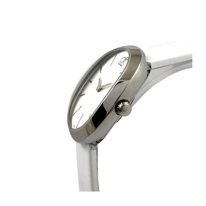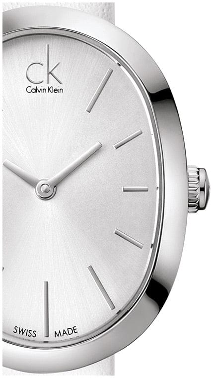 Stainless steel case with a white leather strap. Fixed stainless steel bezel. Silver dial with silver-tone hands and index hour markers. Dial Type: Analog. Quartz movement. Scratch resistant mineral crystal. Pull / push crown. Solid case back. Oval case shape. Case size: 24 mm. Case thickness: 8 mm. Band width: 12 mm. Band length: 6.5 inches. Tang clasp. Water resistant at 30 meters / 100 feet. Functions: hour, minute. Casual watch style. Watch label: Swiss Made. Calvin Klein Incentive Silver Dial White Leather Ladies Watch K3P231L6.