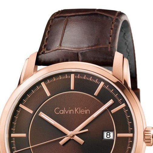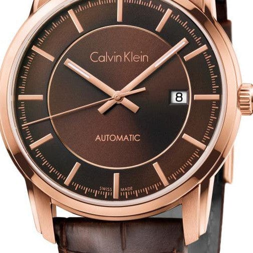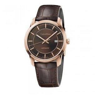 This gents Calvin Klein Infinite watch is made from PVD rose plated stainless steel and is powered by an automatic movement. It is fitted with a brown leather strap and has a brown dial. The watch also has a date function.