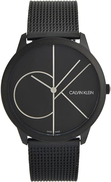 Black dial enhanced by silver-tone hands. Black PVD stainless steel case with a black pvd stainless steel mesh band. Quartz movement. 30 meters / 100 feet water resistance. Fixed bezel. Scratch Resistant Mineral crystal. Solid caseback. Fold Over Slip Through clasp. Pull / Push crown. Case size 40 mm x 7 mm. Band 20 mm x long. Calvin Klein K3M5145X Minimal Watch.