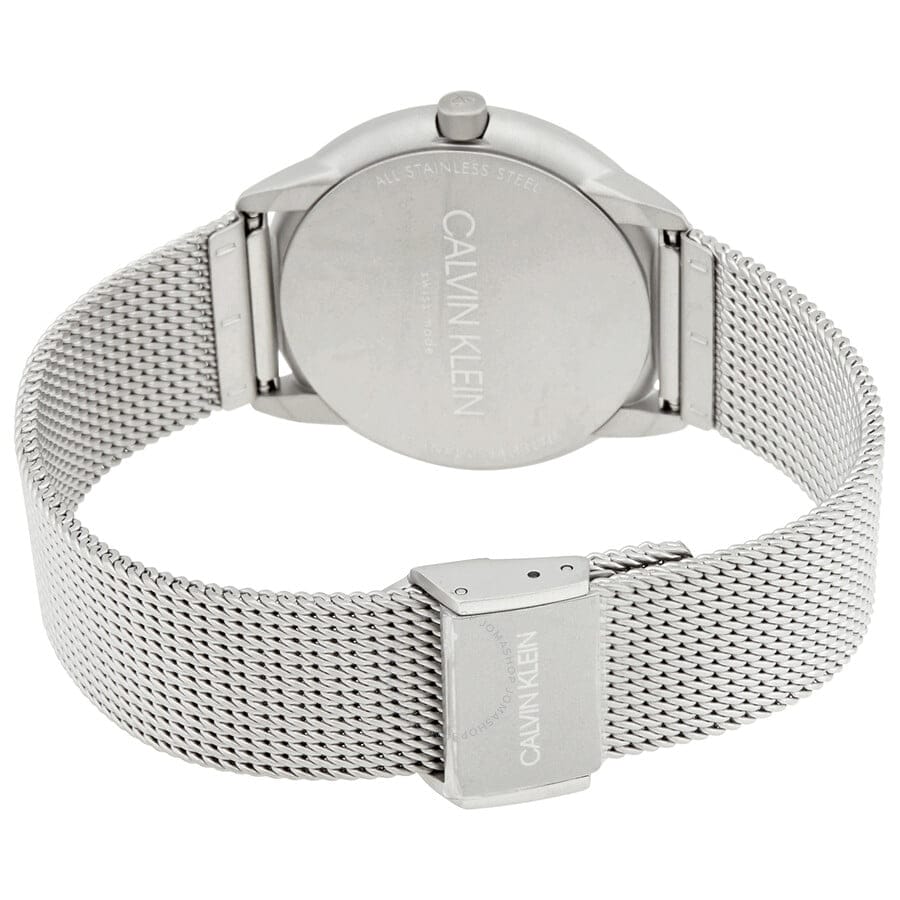 Stainless steel case with a stainless steel mesh bracelet. Fixed stainless steel bezel. White dial with silver-tone hands. No markers. Dial Type: Analog. Quartz movement. Scratch resistant mineral crystal. Pull / push crown. Solid case back. Round case shape. Case size: 35 mm. Case thickness: 7 mm. Band width: 18 mm. Fold over slip through clasp. Water resistant at 30 meters / 100 feet. Functions: hour, minute. Minimal Series. Casual watch style. Watch label: Swiss Made. Calvin Klein Minimal Quartz White Dial Ladies Watch K3M52152.