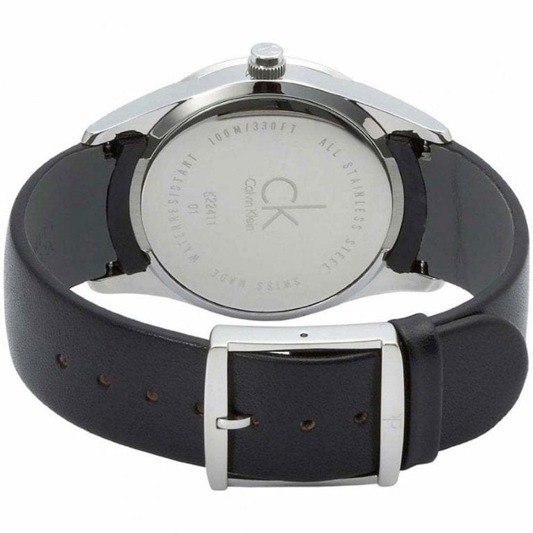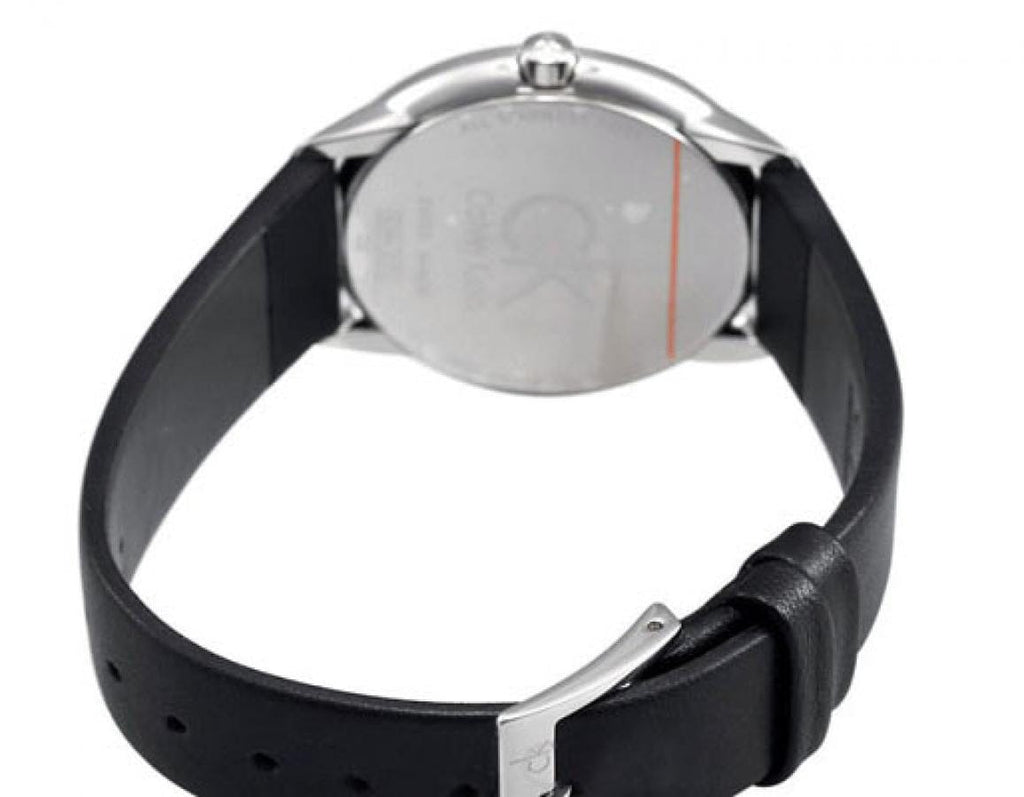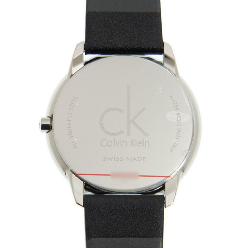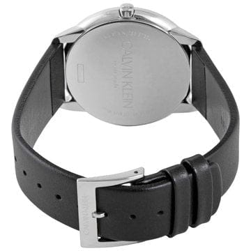 Stainless steel case with a black leather strap. Fixed stainless steel bezel. Black dial with silver-tone hands. Diamonds set at the 3, 6, and 9 o'clock positions. Dial Type: Analog. ETA caliber 901.001 quartz movement. Scratch resistant mineral crystal. Pull / push crown. Solid case back. Round case shape. Case size: 40 mm. Case thickness: 6 mm. Band width: 20 mm. Tang clasp. Water resistant at 30 meters / 100 feet. Functions: hour, minute. Dress watch style. Watch label: Swiss Made. Calvin Klein Minimal Quartz Diamond Men's Watch K3M211CS.