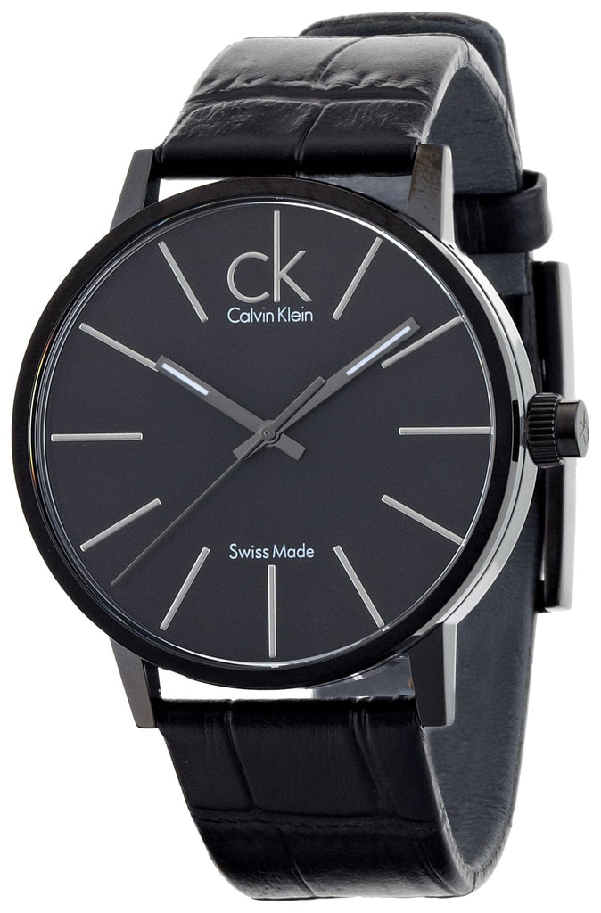 Black PVD black stainless steel case with a black leather strap. Fixed black PVD bezel. Black dial with luminous silver-tone hands and index hour markers. Dial Type: Analog. Luminescent hands. Quartz movement. Scratch resistant mineral crystal. Pull / push crown. Solid case back. Round case shape. Case size: 42 mm. Case thickness: 13 mm. Band width: 20 mm. Band length: 8 inches. Tang clasp. Water resistant at 30 meters / 100 feet. Functions: hour, minute, second. Casual watch style. Watch label: Swiss Made. Calvin Klein Post-Minimal Black Dial Watch K7621401.