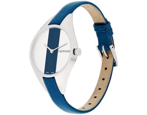 Stainless steel case with a blue leather strap. Fixed stainless steel bezel. Silver and blue dial with silver-tone hands. No markers. Dial Type: Analog. Quartz movement. Scratch resistant mineral crystal. Pull / push crown. Solid case back. Round case shape. Case size: 29 mm. Case thickness: 6 mm. Band width: 8 mm. Tang clasp. Water resistant at 30 meters / 100 feet. Functions: hour, minute. Dress watch style. Watch label: Swiss Made. Calvin Klein Rebel Quartz Silver and Blue Dial Ladies Watch K8P231V6.