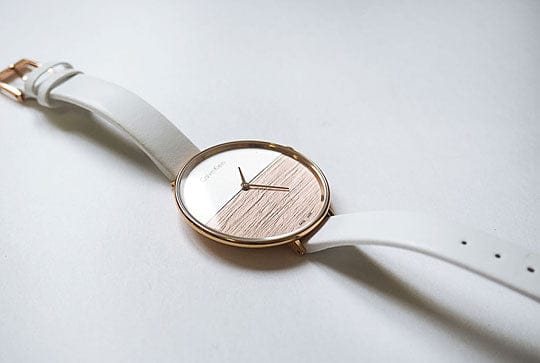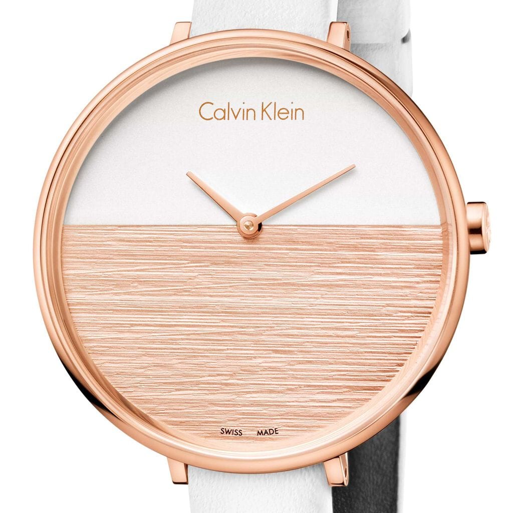 This ultra-slim ladies Calvin Klein Rise watch is made from PVD rose plating and is powered by a quartz movement. It is fastened with a white leather strap and has a multicolour dial.