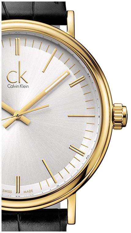 Gold-tone stainless steel case with a black leather strap. Fixed gold-tone stainless steel bezel. Silver dial with silver-tone hands and index hour markers. Dial Type: Analog. Luminescent hands and markers. Quartz movement. Scratch resistant mineral crystal. Pull / push crown. Solid case back. Case size: 43 mm. Case thickness: 8 mm. Round case shape. Band width: 22 mm. Water resistant at 30 meters / 100 feet. Functions: hour, minute, second. Dress watch style. Watch label: Swiss Made. Calvin Klein Surround Silver Dial Men's Leather Watch K3W215C6.