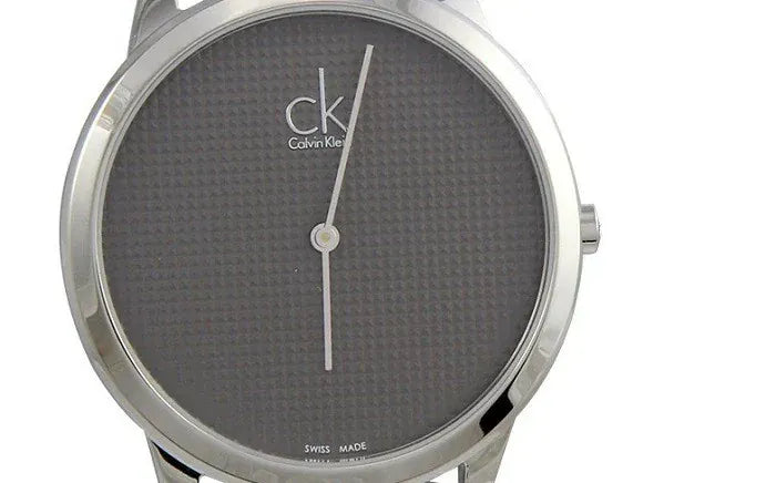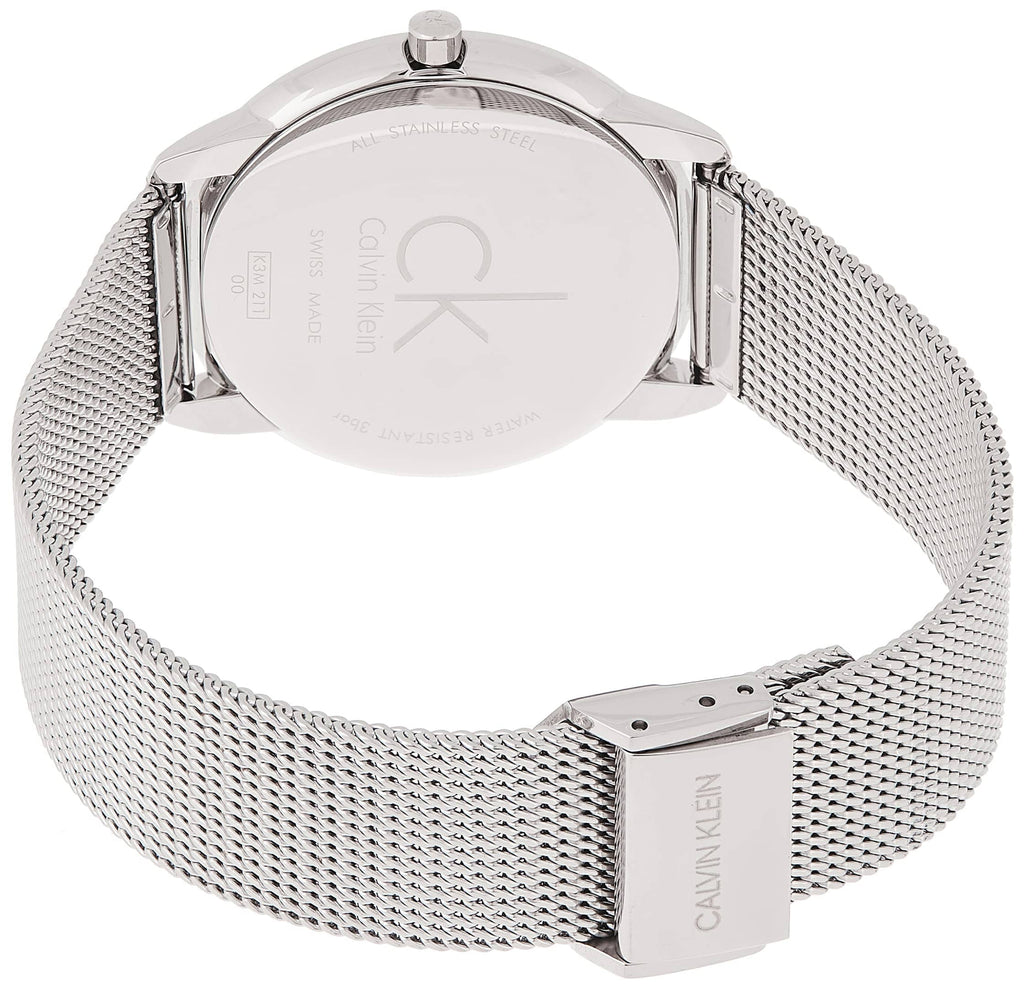 Silver dial enhanced by silver-tone hands. Silver-tone stainless steel case with a silver-tone stainless steel mesh band. Quartz movement. 30 meters / 100 feet water resistance. Fixed bezel. Scratch Resistant Mineral crystal. Solid caseback. Fold Over Slip Through clasp. Pull / Push crown. Case size 40 mm x 7 mm. Band 18 mm x long. Calvin Klein K3M21126 Minimal Watch.