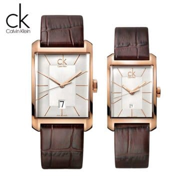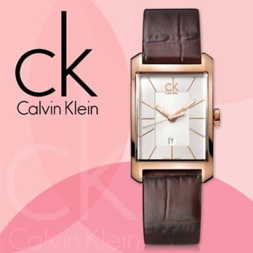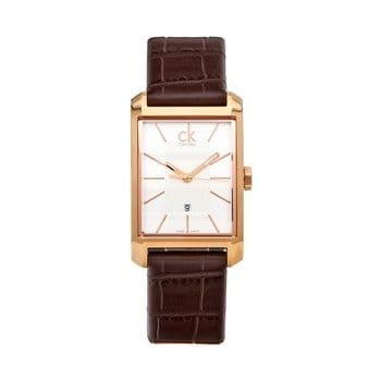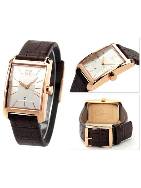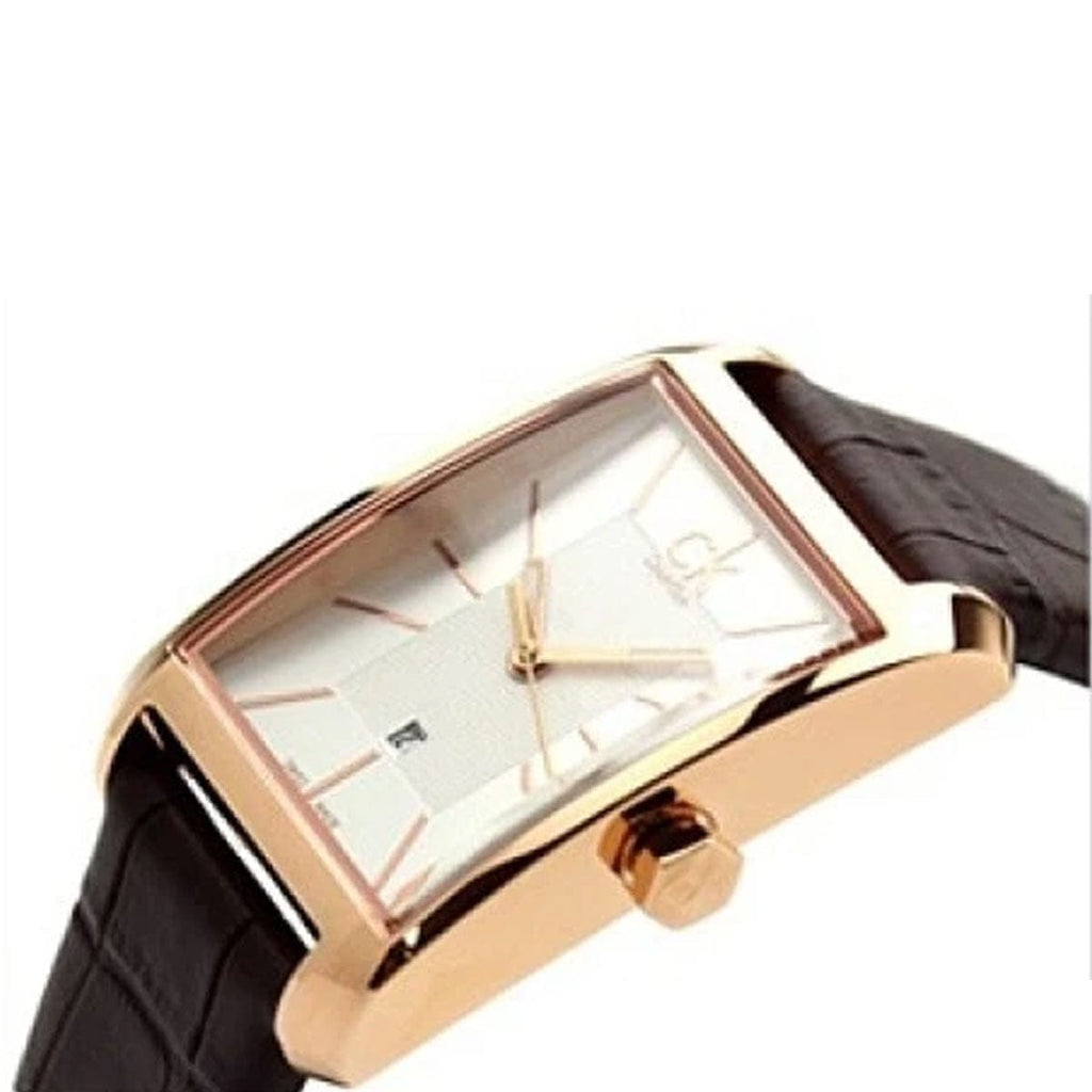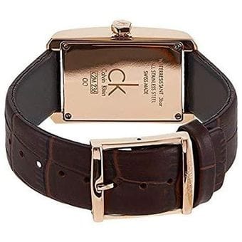 Rose gold-tone stainless steel case with a brown leather strap. Fixed rose gold-tone bezel. Silver dial with rose gold-tone hands and index hour markers. Dial Type: Analog. Date display above the 6 o'clock position. Quartz movement. Scratch resistant mineral crystal. Pull / push crown. Solid case back. Rectangle case shape. Case dimensions: 26 mm x 40 mm. Case thickness: 10 mm. Band width: 18 mm. Band length: 7 inches. Tang clasp. Water resistant at 30 meters / 100 feet. Functions: date, hour, minute, second. Dress watch style. Watch label: Swiss Made. Calvin Klein Window Silver Dial Ladies Watch K2M23620.