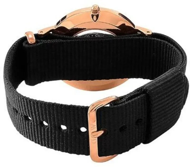 The black textile strap sits comfortably on the wrist and does not create any inconvenience when using the accessory. The circumference is adjustable using a regular strap clasp. At the moment, Daniel Wellington watches are very popular among progressive youth. They are chosen by young, open and purposeful people.