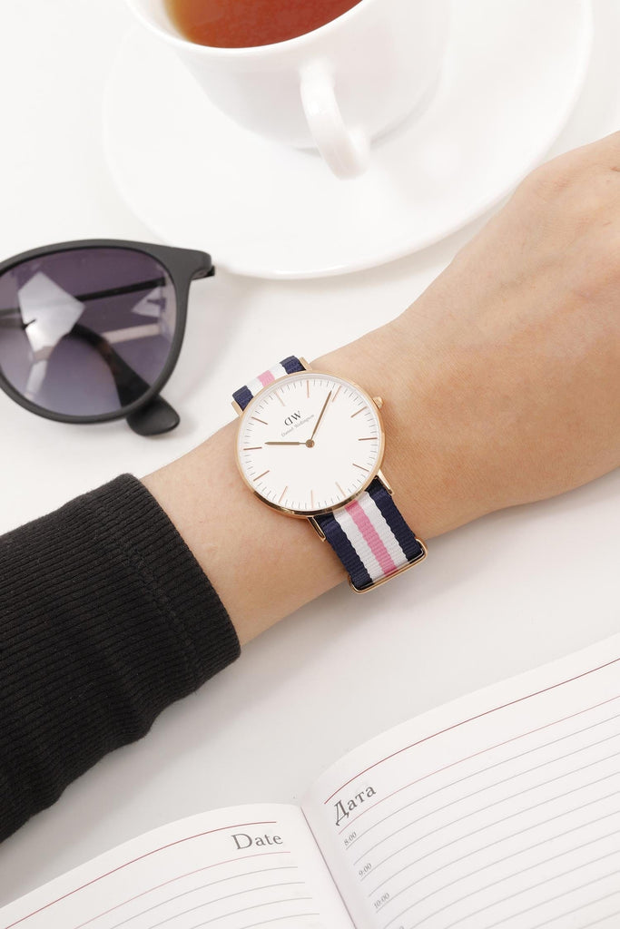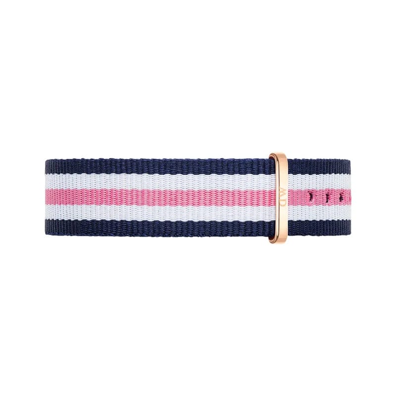 Daniel Wellington Watch Classic 36 Southampton DW00100034. Ultra thin casing, eggshell white dial and perfectly round design. When you add a pink, white and blue NATO band, you get a watch that is fun, minimalistic, classy and elegant all at the same time.