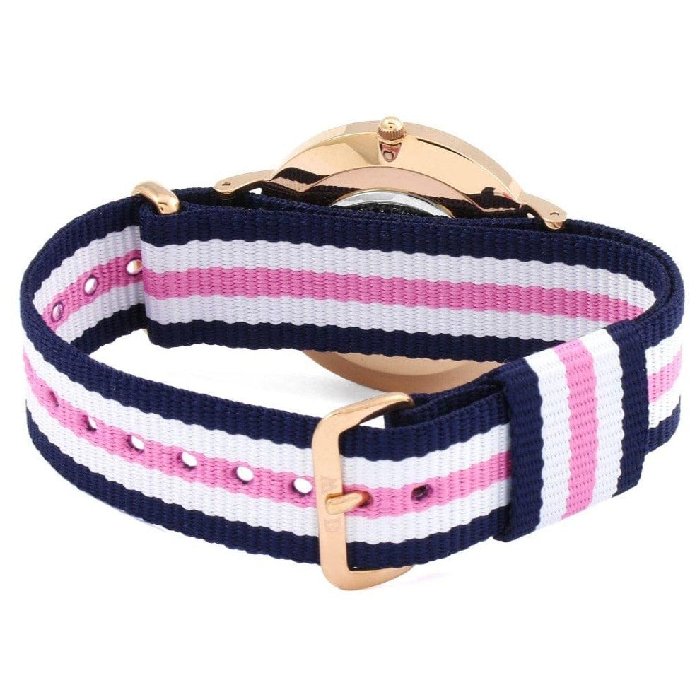 Ultra-thin casing, eggshell white dial and perfectly round design. When you add a pink, white and blue NATO band, you get a watch that is fun, minimalistic, classy and elegant all at the same time.