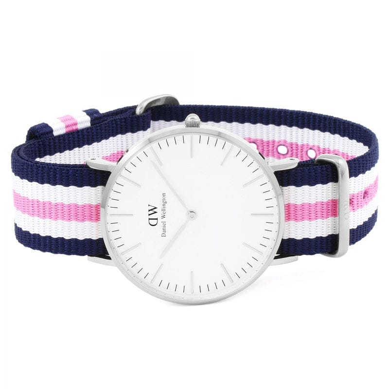 This slim-line Daniel Wellington Classic Southampton Silver Ladies Watch features a 36mm Polished Stainless Steel case, White Dial and fitted with a high quality Japanese quartz movement. This model is supplied with a signature Blue, White and Pink Nato strap.