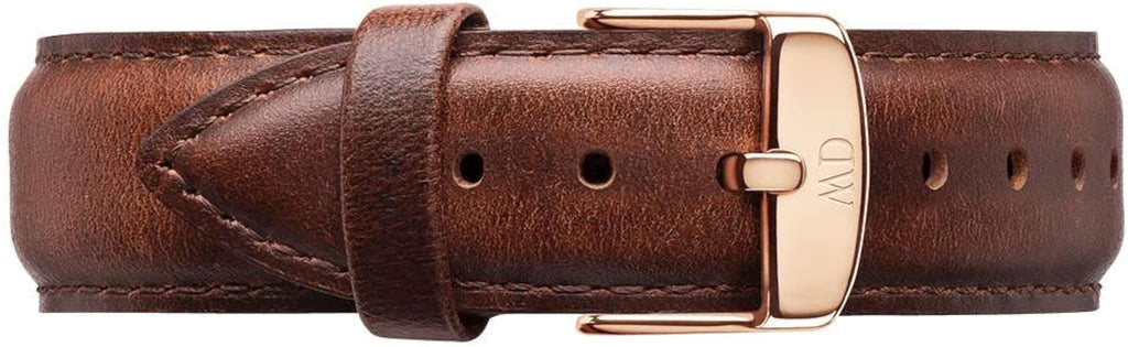 Rose gold-tone stainless steel case with a brown leather strap. Fixed rose gold-tone bezel. Cream dial with rose gold-tone hands and index hour markers. Minute markers around the outer rim. Dial Type: Analog. Quartz movement. Scratch resistant mineral crystal. Pull / push crown. Solid case back. Case size: 40 mm. Case thickness: 6 mm. Round case shape. Tang clasp. Water resistant at 30 meters / 100 feet. Functions: hour, minute. Dress watch style. Daniel Wellington St Mawes Cream Dial Men's Watch DW00100006.