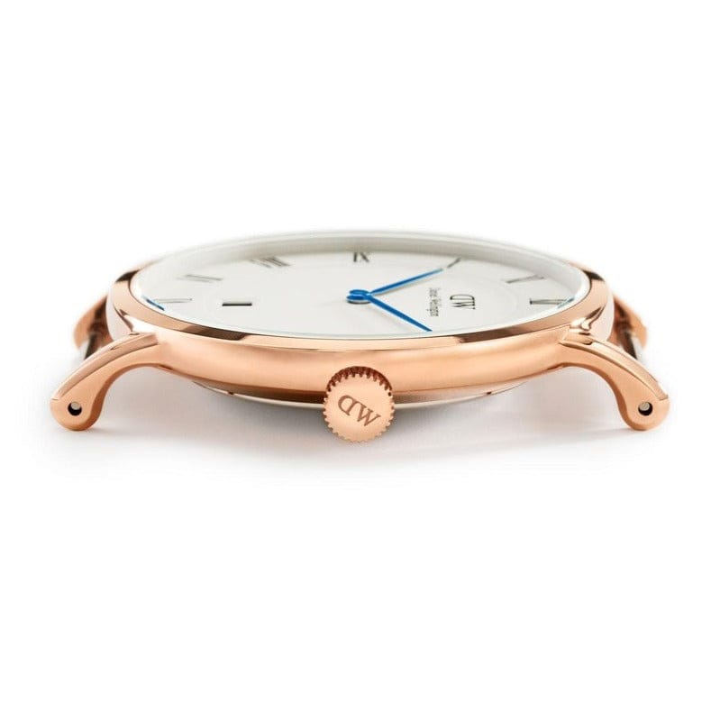 Daniel Wellington Watch Dapper 38 Bristol DW00100086. The Dapper Bristol is an unpretentious and effortless watch that has been designed for every adventure. Made from genuine Italian leather, the deep brown Bristol strap can be paired with a silver or rose gold case, which makes for an elegant and polished watch. The 34mm watch has an eggshell white dial enriched with deep blue hands, Roman numerals and date display, which makes it a great addition to any wardrobe.