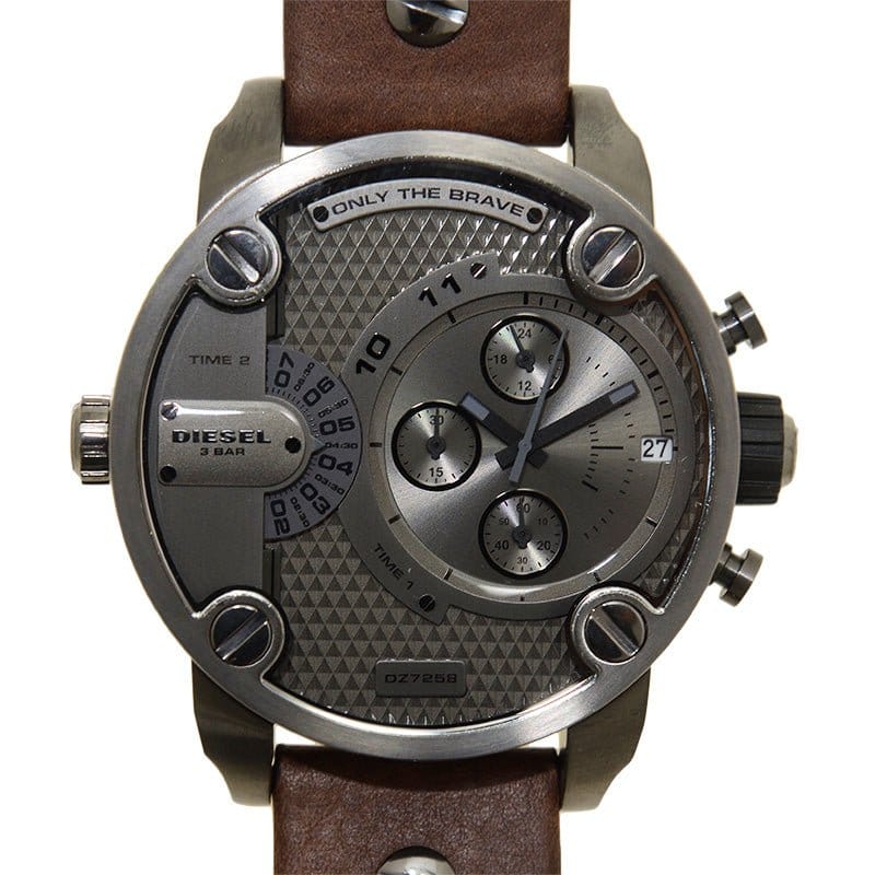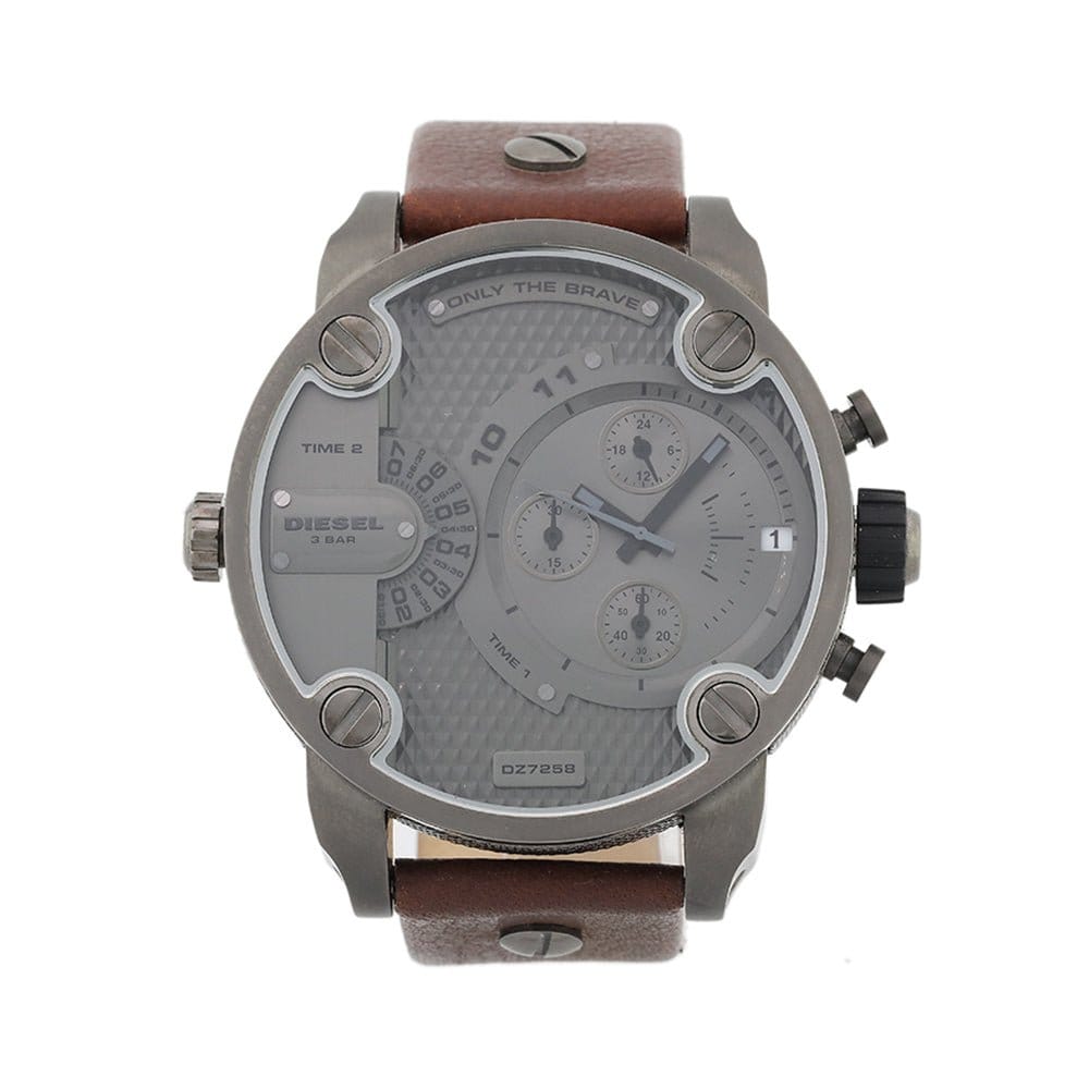 Thus Diesel Daddy DZ7258 comes in gunmetal ion-plated stainless steel case with a brown (calfskin) leather strap. Fixed gunmetal ion-plated bezel. Grey dual time zone dial with luminous dark grey hands. Twin main dials track two different times at once. Dial Type: Analog. Date display at the 3 o'clock position. Chronograph - three inset sub-dials displaying: 60 second, 30 minute and 24 hour. Quartz movement. Scratch resistant mineral crystal. Solid case back. Case diameter: 51 mm. Case thickness: 13 mm. Round case shape. Band width: 20 mm. Tang clasp. Water resistant at 30 meters / 100 feet. Functions: chronograph, date, hour, minute, second. Sport watch style.