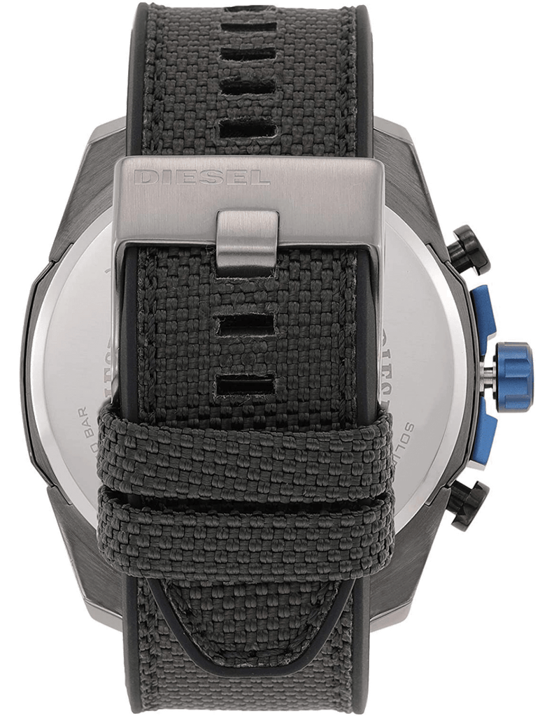 A classic Diesel watch from the Mega Chief collection. With an oversized 53 x 14mm gunmetal grey IP case, the watch features a chic grey dial with blue accent hour markers and second hand, three mini chronograph dials and a 26mm black material strap. Water resistant 100m.