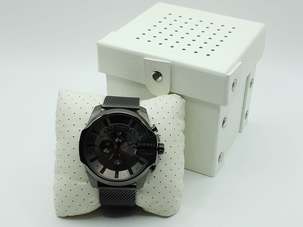 This 51mm Mega Chief watch features a gray sunray dial with black stick indexes, chronograph movement and gunmetal stainless steel mesh bracelet.