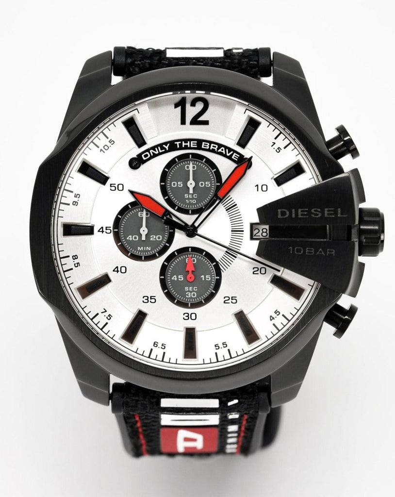 This 51mm Mega Chief watch features a silver dial with black indexes and black printed tracking, chronograph movement and black nylon and silicone strap with white and red Diesel logo detail.