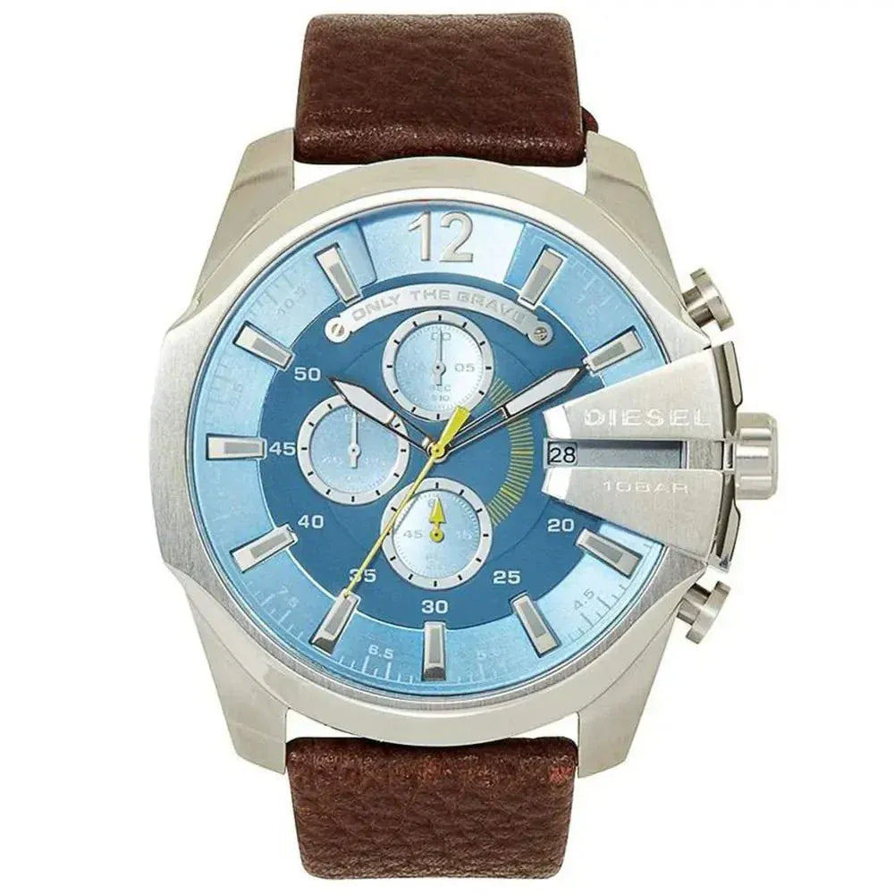 Diesel Mega Chief Light Blue Dial Brown Leather Strap Watch For Men - DZ4281