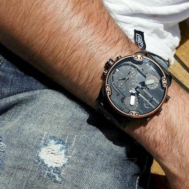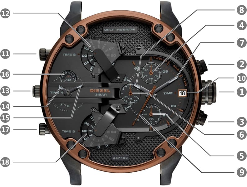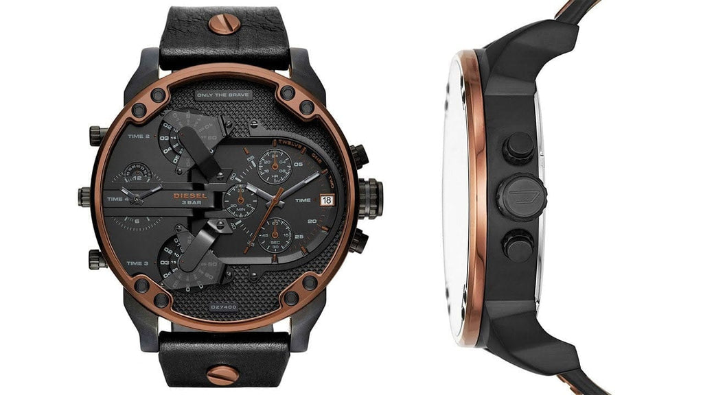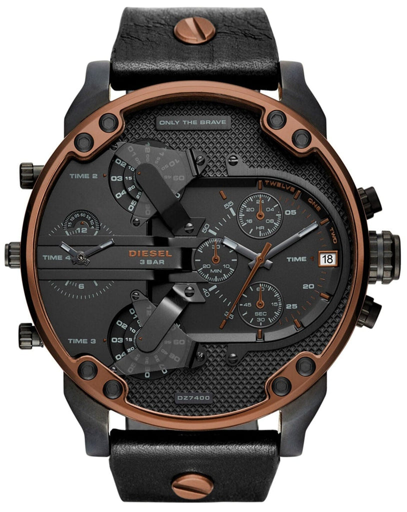 The Diesel Mr. Daddy 2.0 Collection features four separate time zones, two of which are jump hour disc displays, another analog with sub-seconds and finally, a complete chronograph with stopwatch and date. Already recognized as the most successful and most iconic case body in the range, The Daddy series continues to push the envelope of innovation.