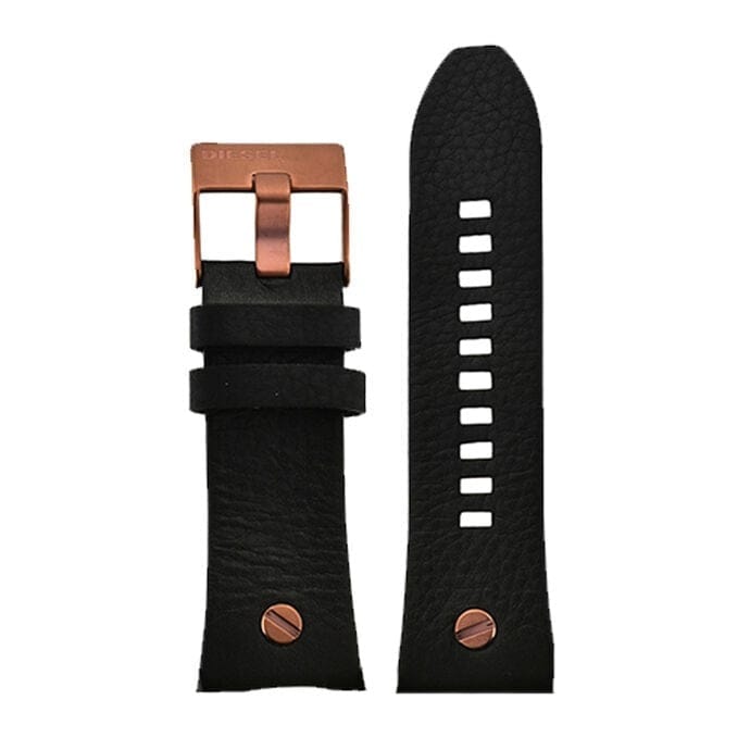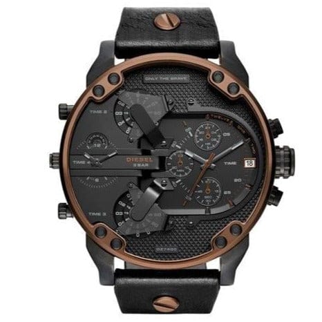 Commanding and stylish, the Diesel Mr. Daddy 2.0 watch showcases an insanely detailed chronograph black dial with copper indexes. A bold, two-tone stainless-steel IP case with copper topring and black leather strap complete the look.