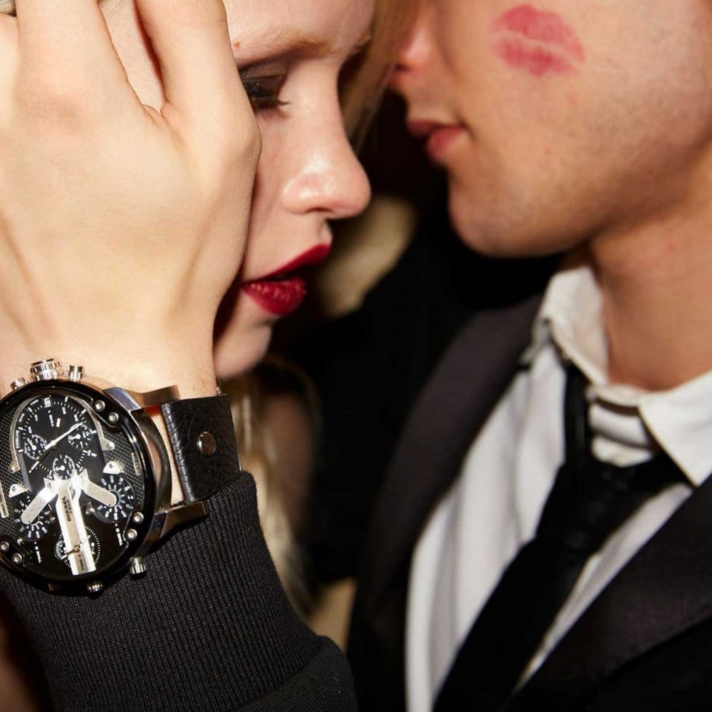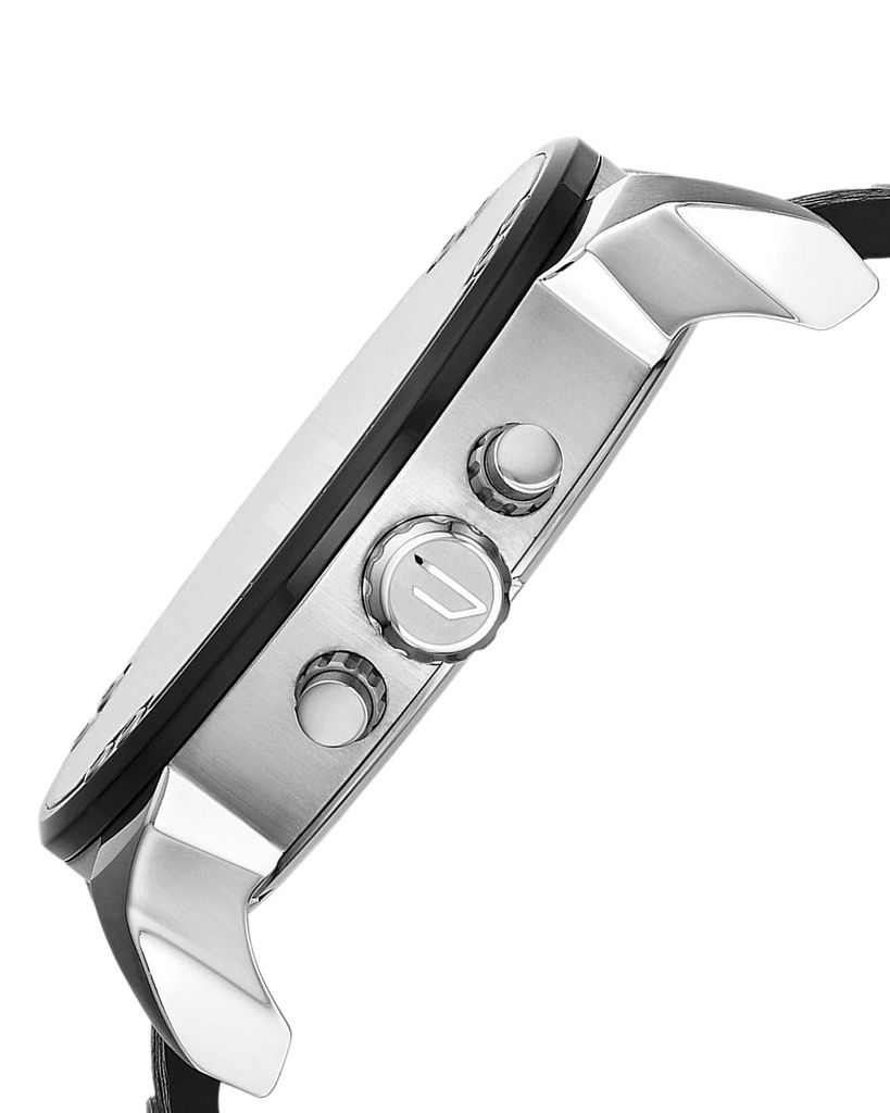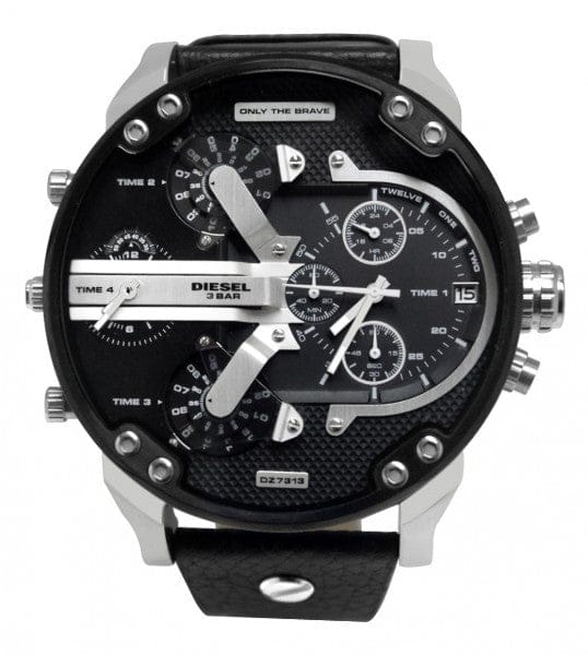 DIESEL Watch collection Mr Daddy 2.0, ref. DZ7313. The case (57 mm) is made of glossy-satin steel with black IP treatment. The multilayer dial, with 'texture' on the black bottom, features transparent black acetate inserts and metal applications, including the Diesel logo plate. This watch has 4 time zones with quartz movement, one of which has chronographic functions of hours, minutes, seconds, and more. Waterproof up to 3 ATMs. Glass in mineral crystal. Black leather strap with personalized buckle closure.