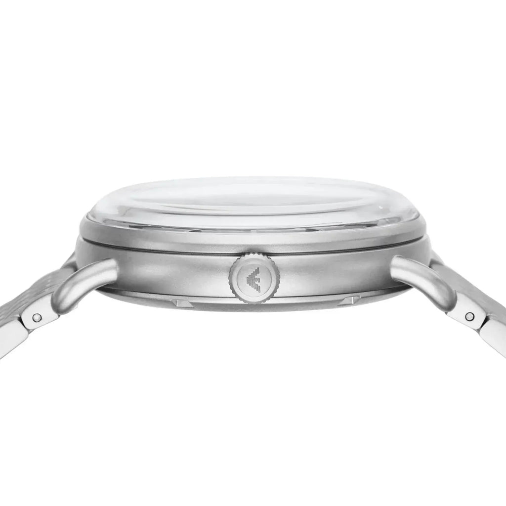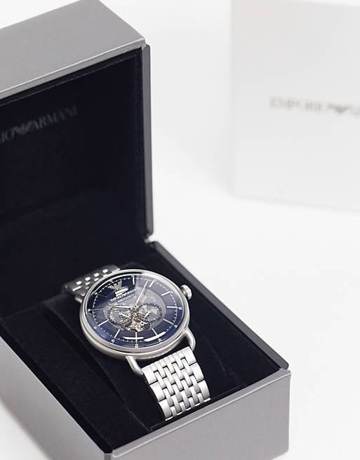 Emporio Armani's 43mm watch features a blue skeleton dial with silver-tone stick indexes, multifunction movement and stainless steel bracelet.