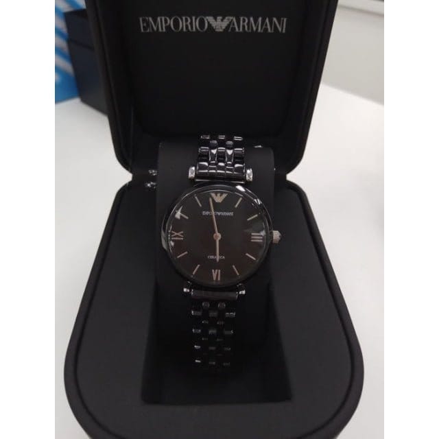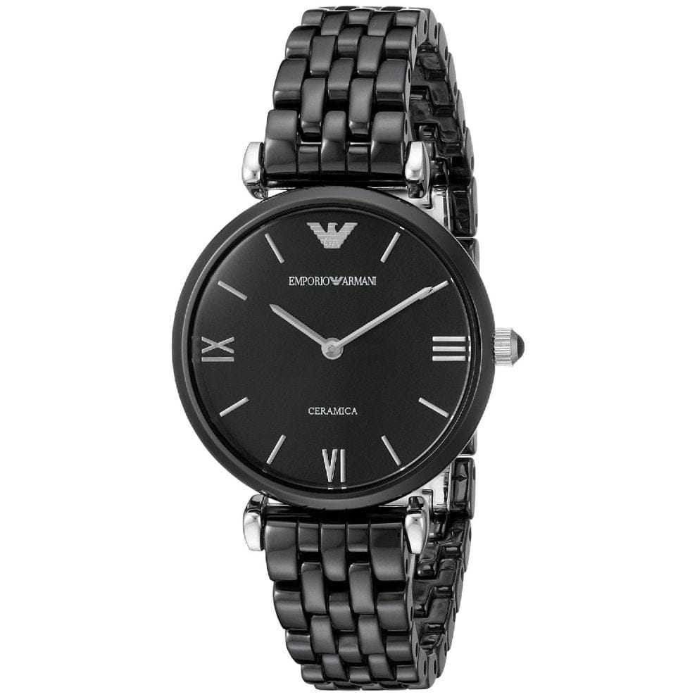 Black ceramic case and bracelet. Fixed black stainless steel bezel. Black dial with silver-tone hands and Roman numeral and index hour markers. Dial Type: Analog. Quartz movement. Scratch resistant mineral crystal. Solid case back. Round case shape, case size: 32 mm, case thickness: 7.5 mm. Band width: 14 mm. Deployment with push button release clasp. Water resistant at 30 meters / 100 feet. Functions: hour, minute. Ceramica Series. Casual watch style. Emporio Armani Ceramica Black Dial Black Ceramic Quartz Ladies Watch AR1487.