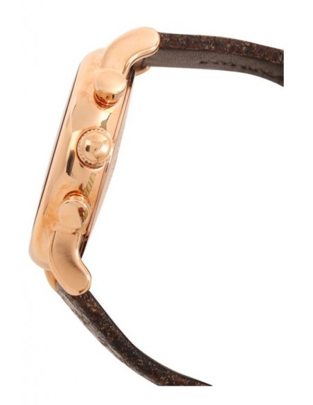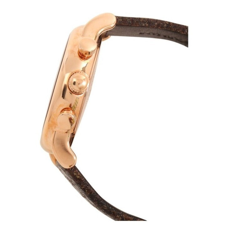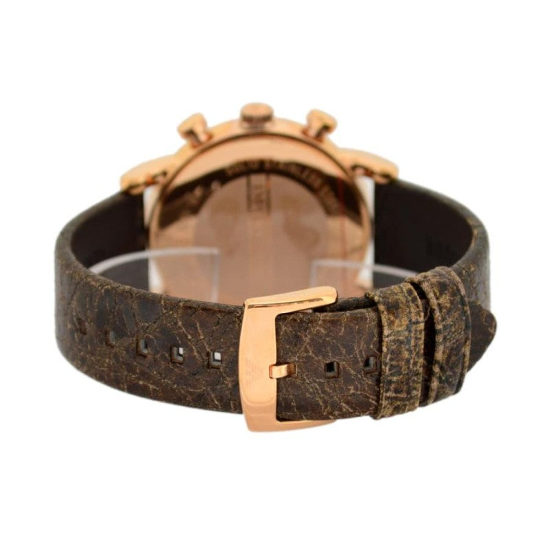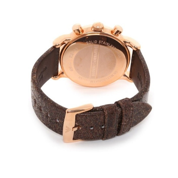 Rose gold-tone stainless steel case with a brown leather strap. Fixed rose gold-tone bezel. Brown dial with rose gold-tone hands and index hour markers. The Emporio Armani logo marks the 12 o'clock position. Dial Type: Analog. Date display between 4 and 5 o'clock positions. Chronograph - three sub-dials displaying: 60 second, 30 minute and 24 hour. Quartz movement. Scratch resistant mineral crystal. Pull / push crown.