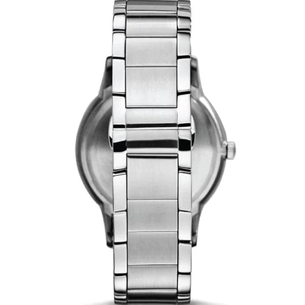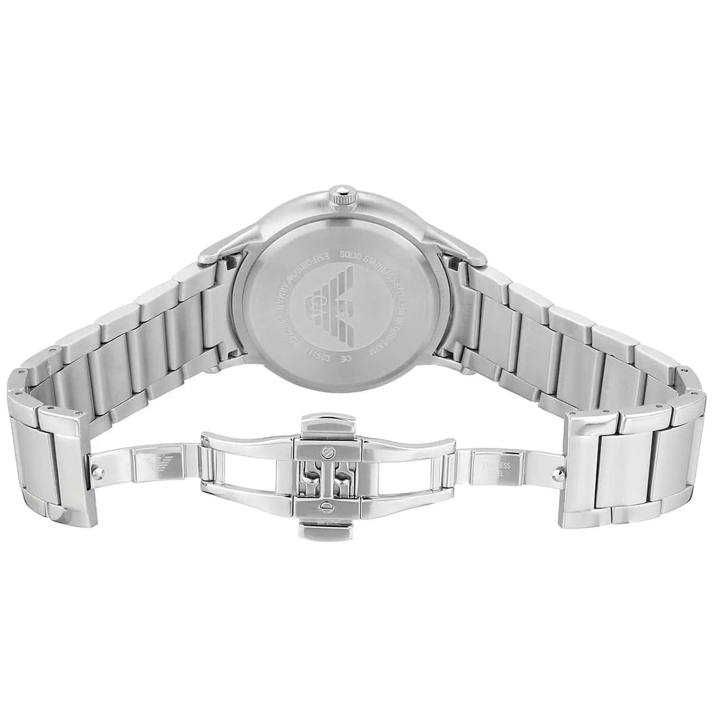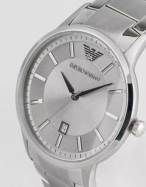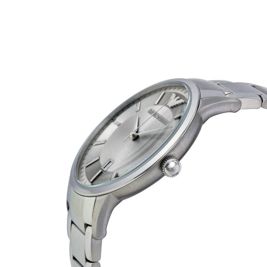 Stainless steel case with a stainless steel bracelet. Fixed stainless steel bezel. Silver dial with silver-tone hands and index hour markers. The Emporio Armani logo appears at the 12 o'clock position.