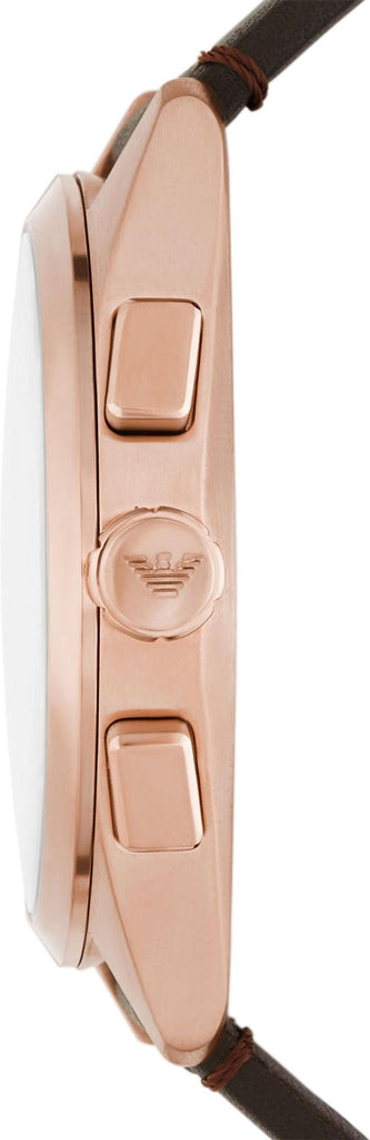 Emporio Armani's 43mm watch features a blue sunray dial, chronograph movement and brown leather strap.