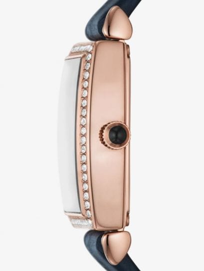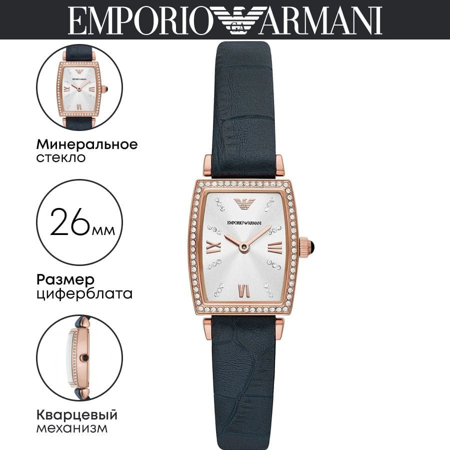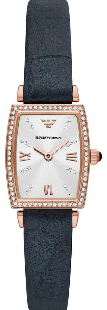 The Emporio Armani Gianni Strap AR11469 watch combines a 26mm rectangle shaped rose gold-tone stainless-steel case with crystal set bezel and a navy-blue leather strap with a traditional buckle.It has a silver analogue dial with rose gold-tone roman numerals & crystal set indexes which are protected beneath a mineral crystal glass. Power is generated by the quartz movement. This model also has a water resistance of up to 30 metres. Case Depth Approx. 8.00 mm.