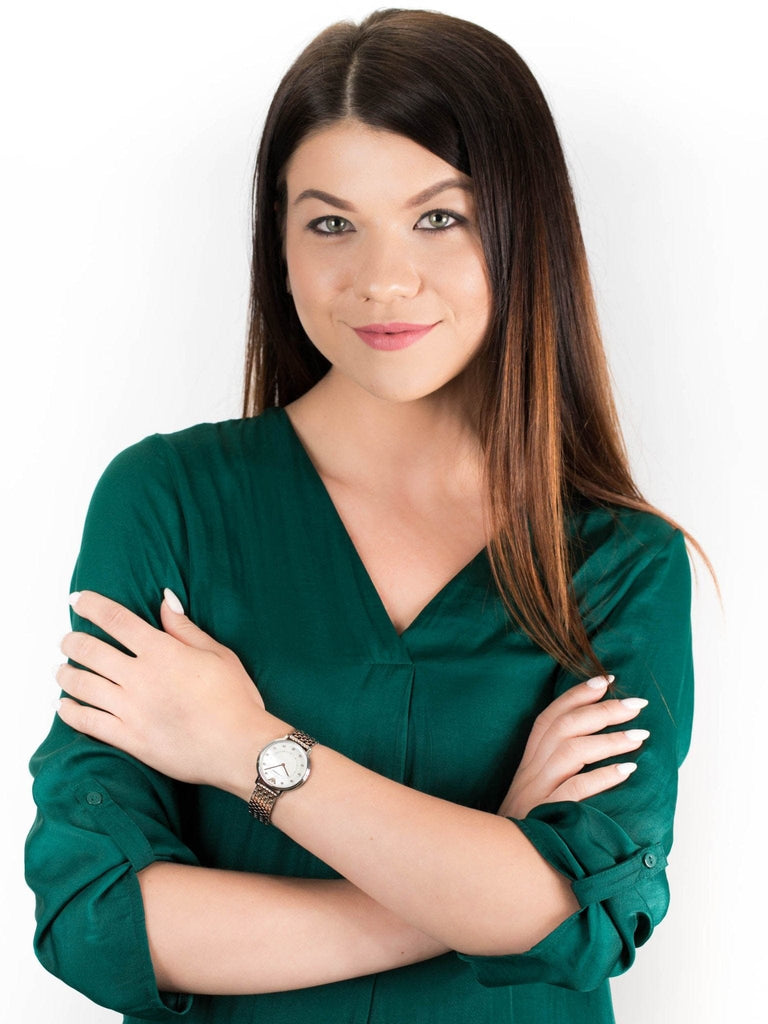 - Mother of pearl dial with clear glass stones as indexes and rose gold eagle logo - 2 hand movement - rose gold hands - mineral glass