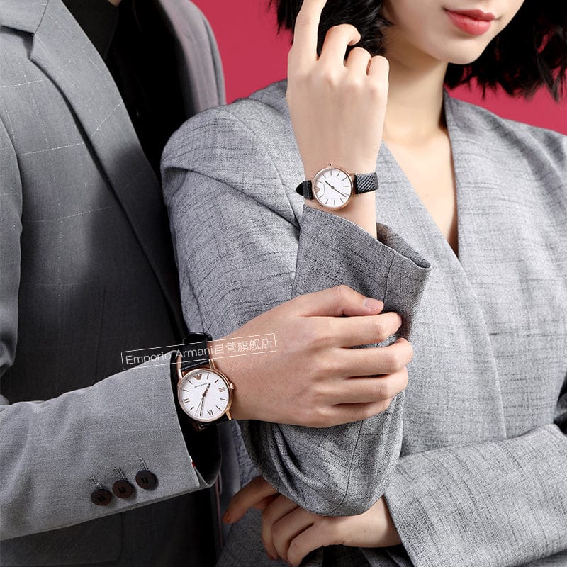 Solid case back. Round case shape, Ladies case size: 41 mm. Men's case size: 48 mm. Tang clasp. Water resistant at 30 meters / 100 feet. Functions: hour, minute, second. Emporio Armani Silver Dial Mens/Ladies Watch Set AR80015.