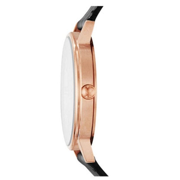 Rose gold-tone stainless steel case with a black leather strap. Fixed rose gold-tone bezel. Silver dial with rose gold-tone hands and index hour markers. Dial Type: Analog. Quartz movement. Scratch resistant mineral crystal. Pull / push crown.
