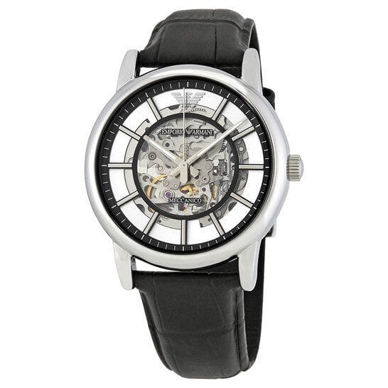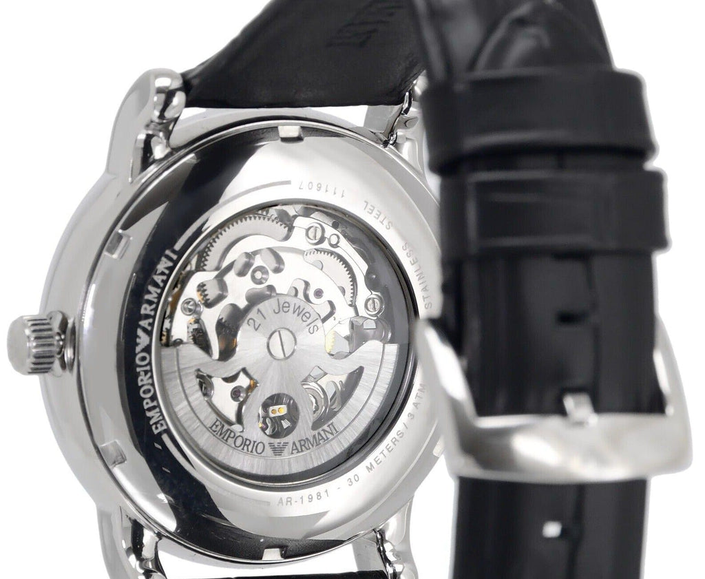 Silver-tone stainless steel case with a black leather strap. Fixed silver-tone stainless steel bezel. Skeleton dial with silver-tone hands and index hour markers. Dial Type: Analog. Luminescent hands and markers. Automatic movement. Skeleton transparent exhibition see through case back. Case size: 43 mm. Case thickness: 13 mm. Round case shape. Band width: 22 mm. Water resistant at 30 meters / 100 feet. Functions: hour, minute, second. Dress watch style. Armani Luigi Skeleton Dial Men's Leather Watch AR1981.