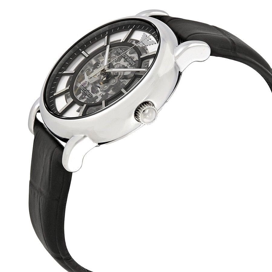 Emporio Armani Luigi Silver Skeleton Dial Black Leather Strap Watch For Men - AR1981