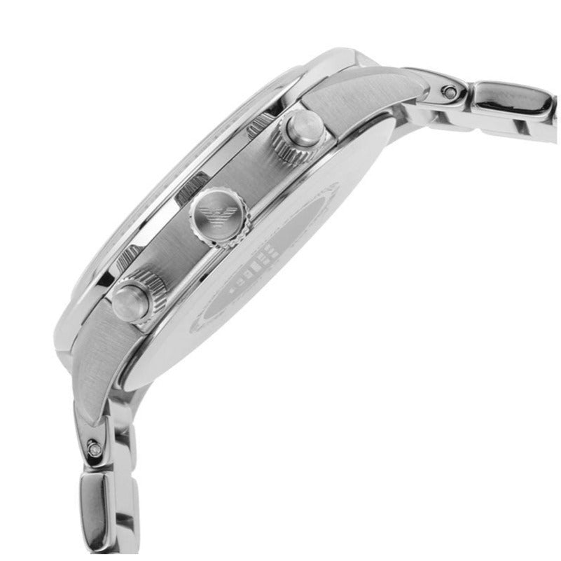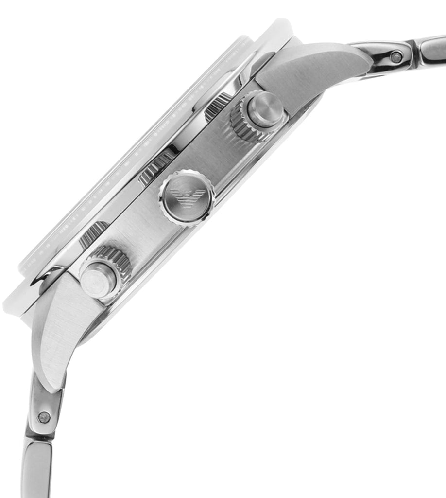 Crafted in a brushed stainless steel, this stylish timepiece is the perfect accessory for everyday wear. The piece features a contrasting navy blue chronograph dial with a date window at 4 o’clock. The dial is adorned with stainless steel hour batons and hands with the iconic Emporio Armani eagle logo at 12 o’clock.