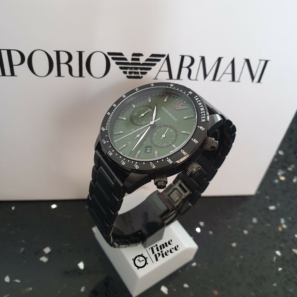 Emporio Armani Mario Chronograph Green Dial Black Steel Strap Watch For Men - AR11472