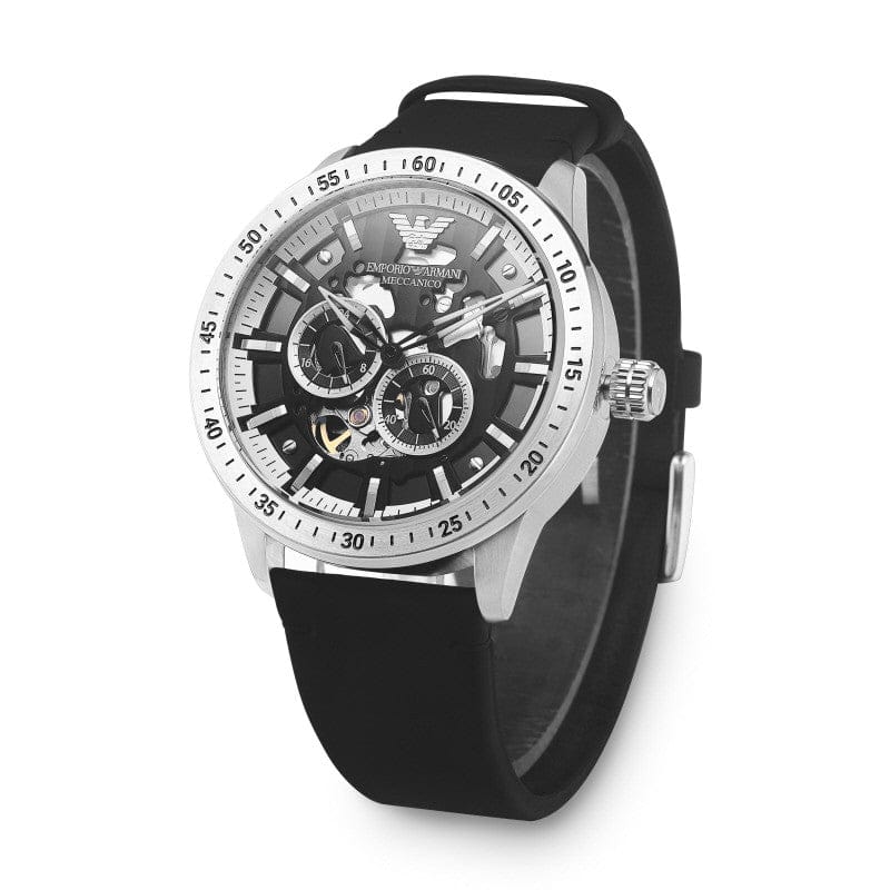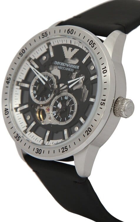 Emporio Armani's 43mm watch features a three layered dial with black Côtes de Genève and multiple finishings, automatic movement and black leather strap.