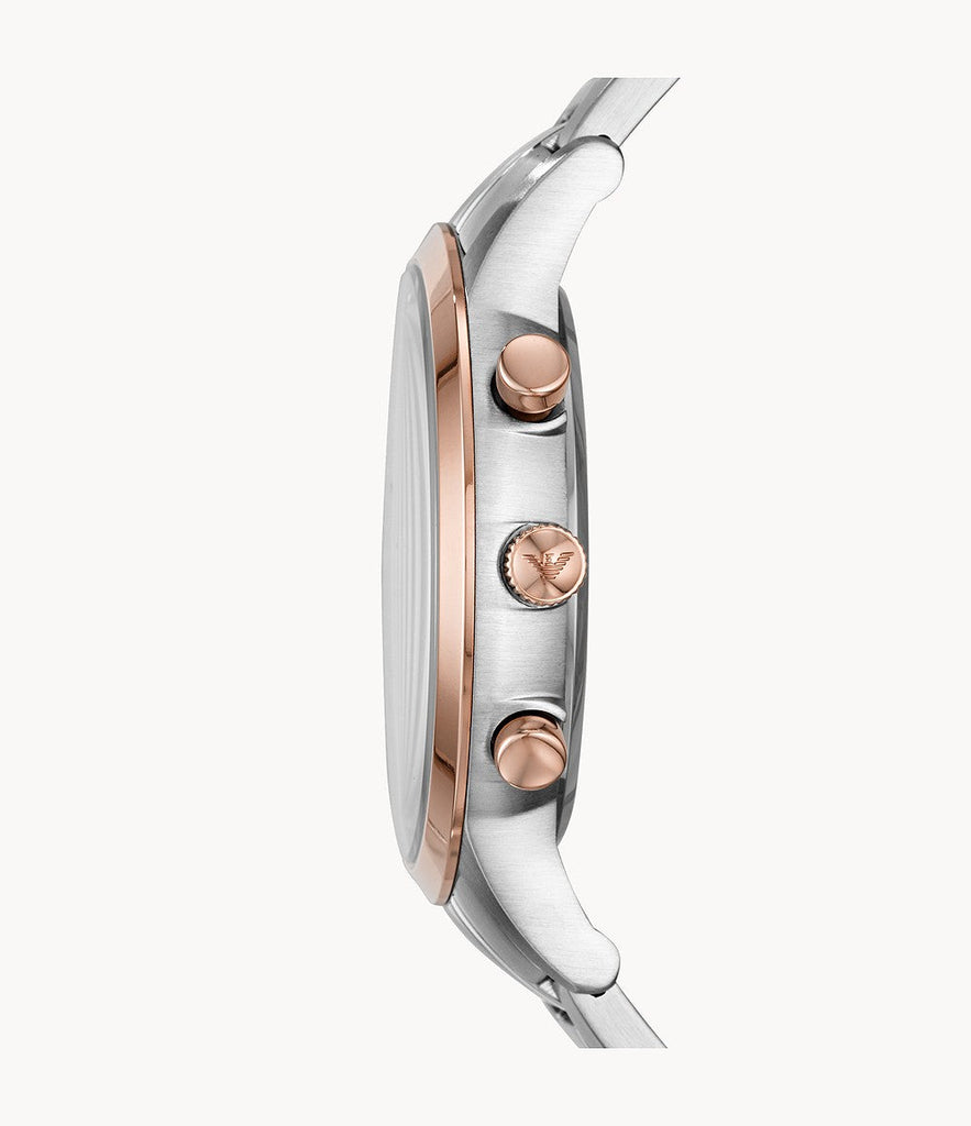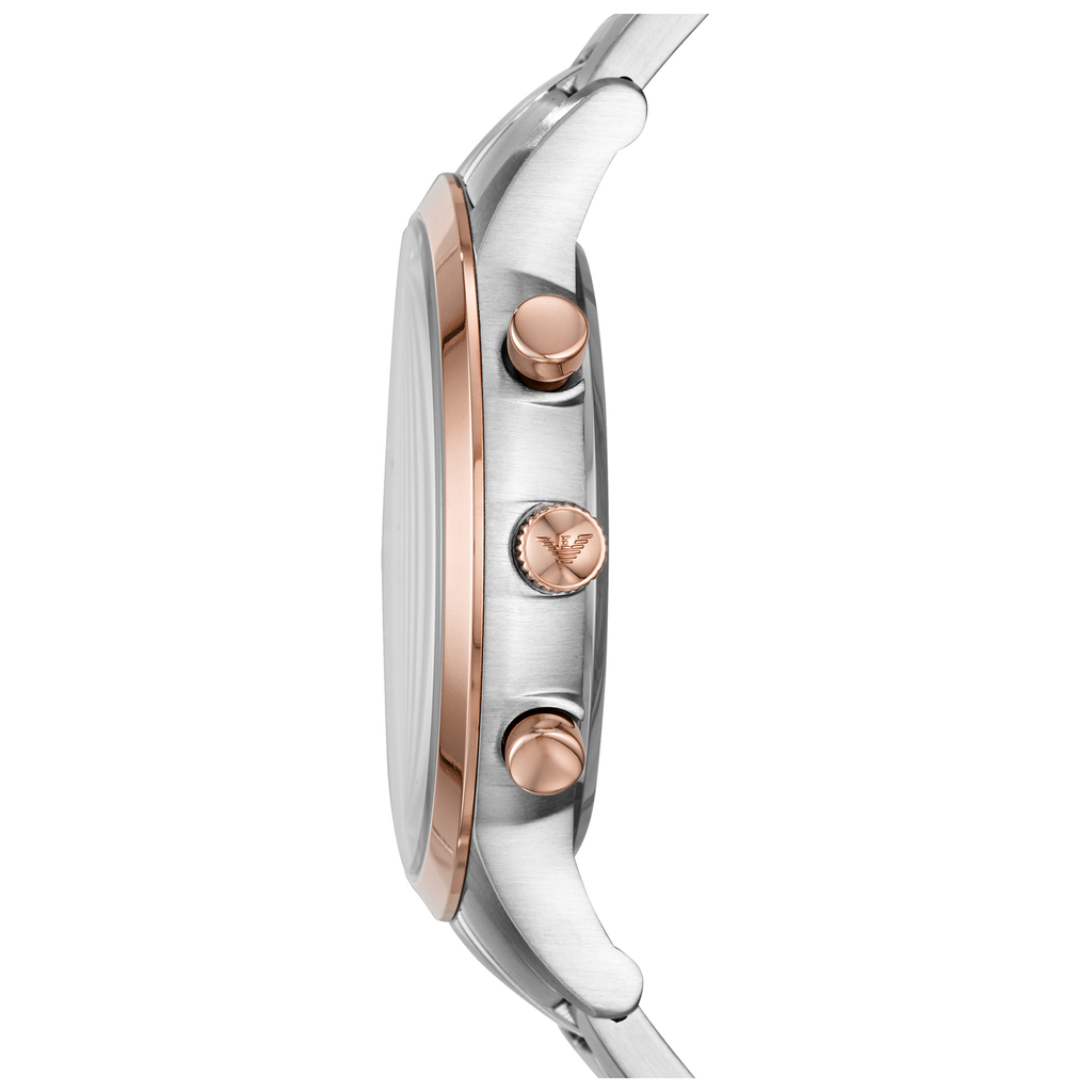 Emporio Armani Renato AR80025 is a functional and very impressive Gents watch. Case material is Stainless Steel while the dial colour is Blue. It has an elegant two-tone strap (Silver and Bronze). This Quartz movement watch has a case size of 43mm and its water resistance of up to 50m makes it perfect for everyday use and activities including light sports activities.